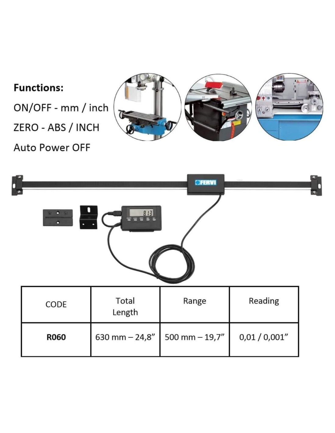 L'échelle peut être coupée pour atteindre la longueur souhaitée fonctions : marche/arrêt - mm/pouce - zéro - abs/inc - arrêt automatique.