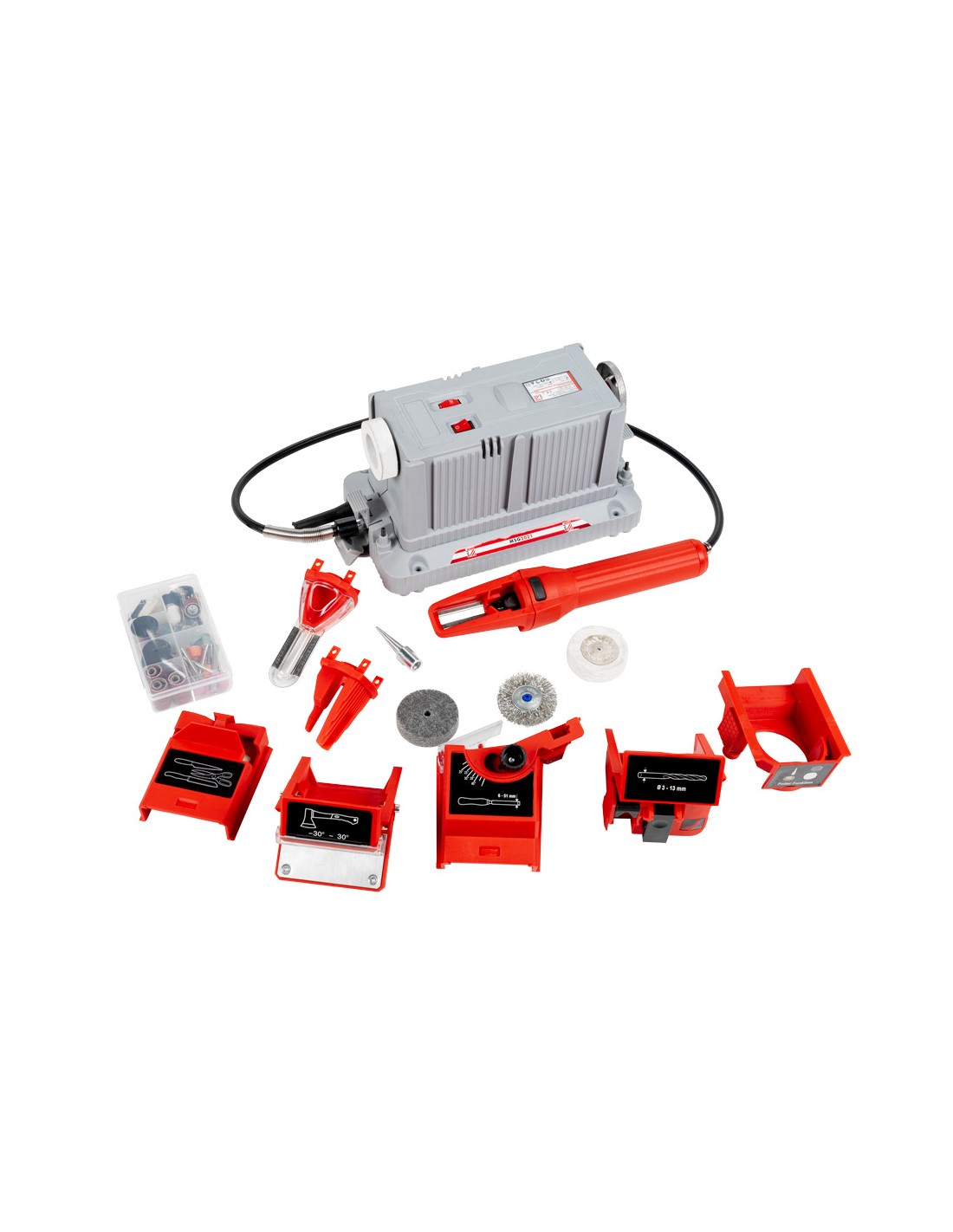 Équipement : Disque diamanté Ø 51 x Ø 10 x 7,5 mm, disque corindon Ø 50 x Ø 11 x 8 mm, rouleaux en caoutchouc Ø 12 mm, 8 cylindres d'affûtage D.12,7 mm (grain 120) ; pâte à polir, meule en laiton, disque éponge, disque de polissage, rouleau en caoutchouc D.6 mm, cylindre abrasif D.6,3 mm (grain 120), disque abrasif D.20 mm (grain 180) ; disque de tronçonnage D.24 (10x marron ; 20x noir) ; cylindre abrasif en corindon 6x10 mm, cône abrasif en corindon (10x6 mm) ; bille abrasive en corindon (10 mm) ; disque abrasif en carborundum (1x 20x6 mm, 1x 10x6) ; cylindre de ponçage en corindon (1x 15x10 mm, 1x 10x13 mm), pinces de serrage (2,4 x 4,4 x 17 mm), support pour disque de ponçage et de tronçonnage, support pour disque en feutre, brosse en nylon 15x9, brosse en acier inoxydable 5x27 mm ; disque avec brosse en nylon 22 ; Disque avec brosse en acier inoxydable 22 22; Stylo de gravure sur bois D.2 mm; Stylo de gravure diamant D.2 mm; Adaptateur de meulage (taille-haie / tronçonneuse, lames / outils); Disque en feutre (Ø 25 mm, Ø 12 mm, 3x Ø 9 mm), pierre à aiguiser, pointe de meulage en corindon Ø 6x10 mm, pointe de gravure diamantée, plaquettes de lime pour tronçonneuse (4, 5, 6 mm)