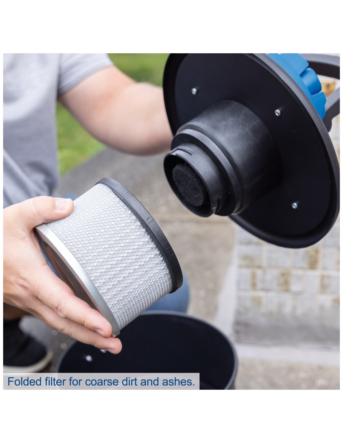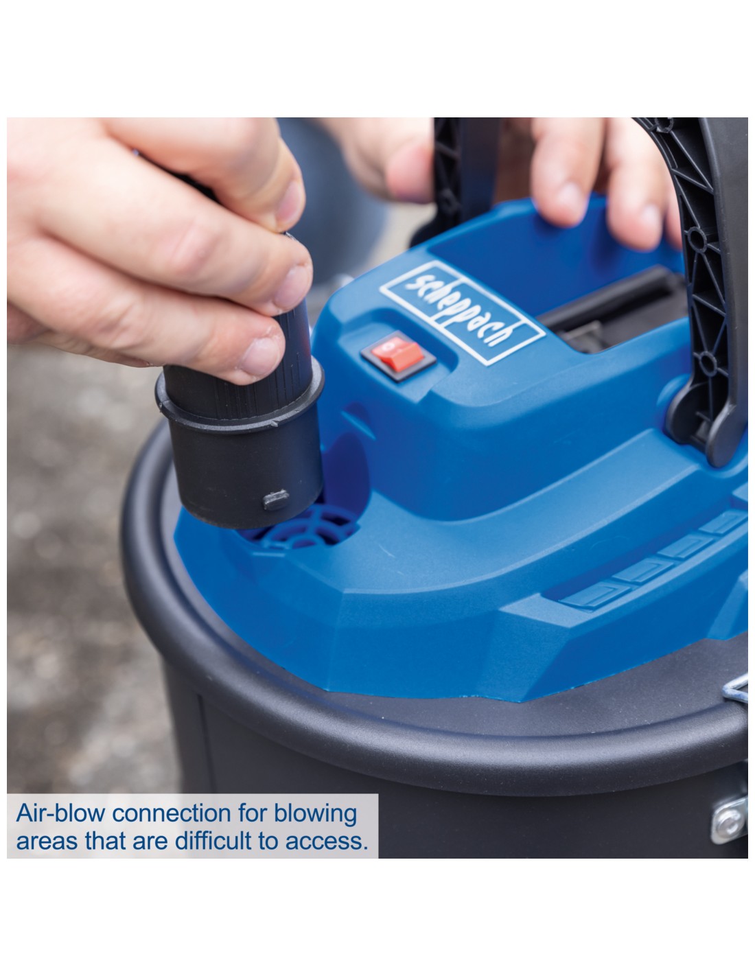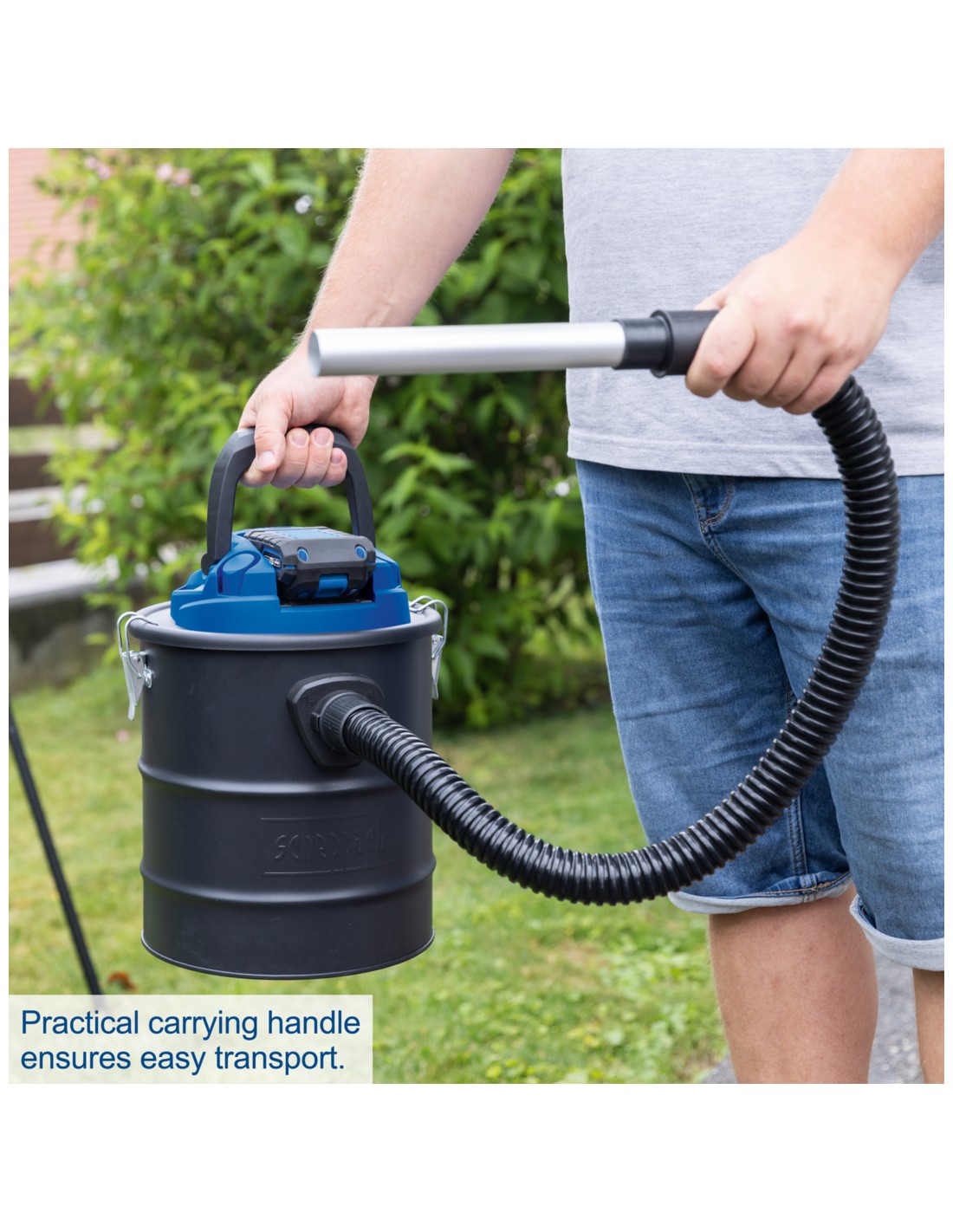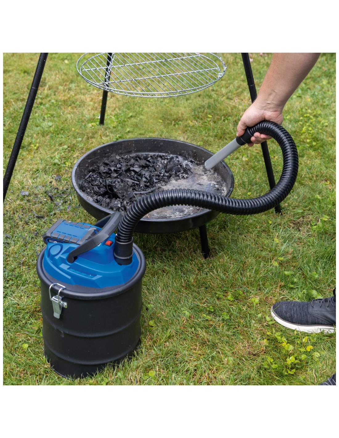 ASPIRATEUR À CENDRES SANS FIL 15 L • Aspirateur à cendres compact avec une capacité d’aspiration de 10 kPa pour un poêle à bois ou un barbecue propre • Fonctionnement sans fil avec la série Scheppach IXES 20 V – toutes les batteries et tous les chargeurs de cette série peuvent être combinés avec l’aspirateur à cendres sans fil • Collecteur métallique robuste d’une capacité de 15 L • Grand rayon d’action grâce au tube en aluminium, au tuyau ignifuge de 230 mm et au tuyau d’aspiration de 1 000 m - Raccord de soufflerie pour les zones de soufflage difficiles d'accès - Filtre repliable pour les grosses saletés et les cendres - Verrouillage rapide pour un vidage facile du collecteur - Poignée de transport pratique pour un transport aisé