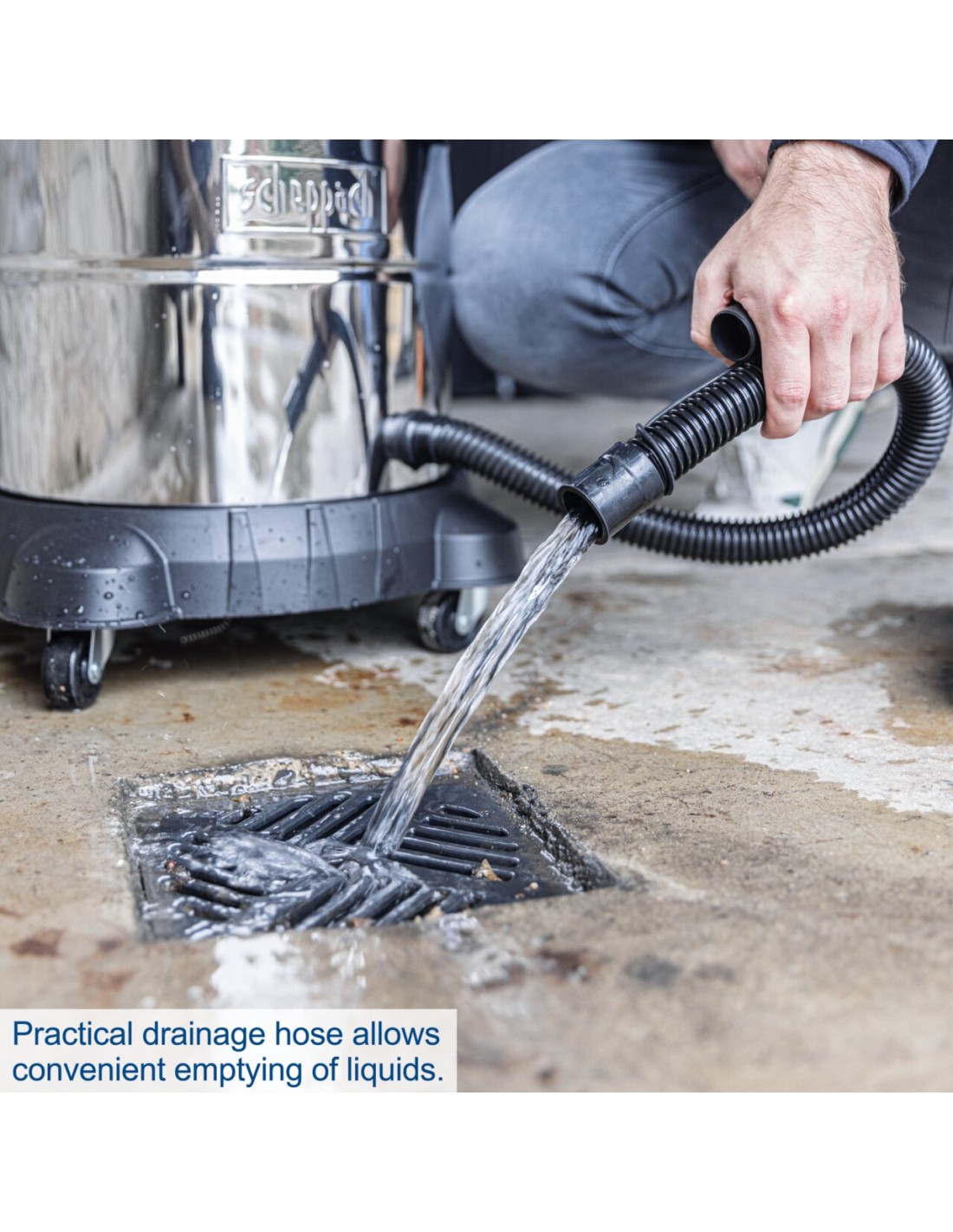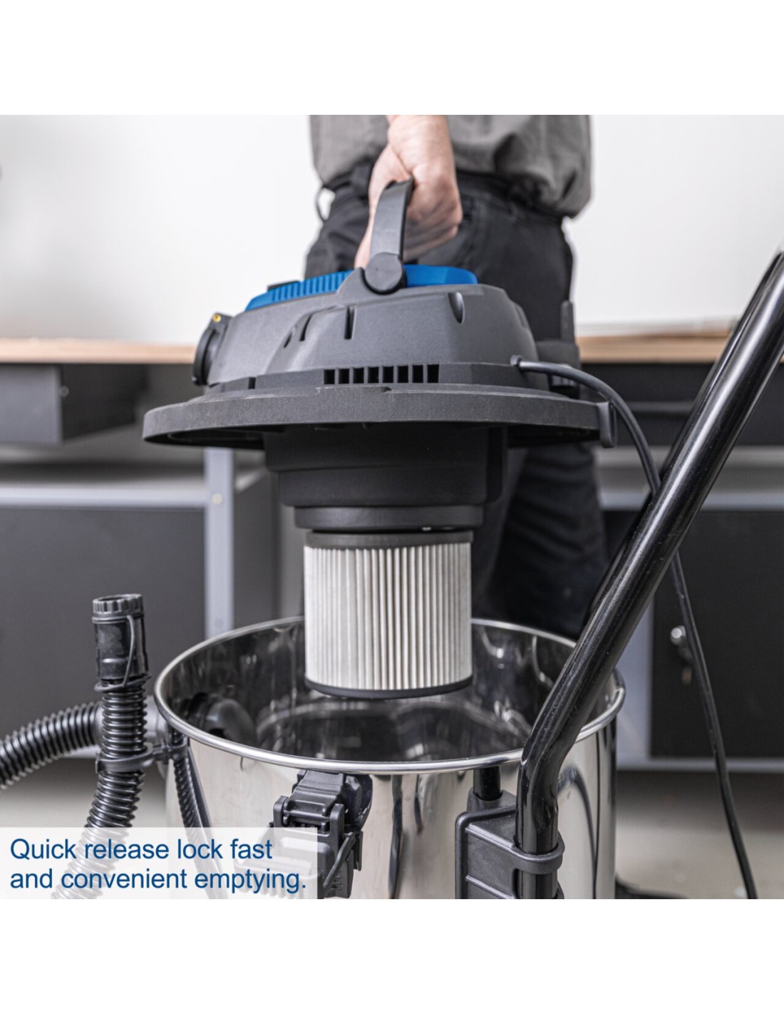 ASPIRATEUR SOLIDES / LIQUIDES ÉLECTRIQUE 50 L • Aspirateur solide / liquide puissant avec 20 kPa pour l'aspiration de liquides, l'aspiration de matières sèches et le soufflage • Récipient de collecte robuste en acier inoxydable d'une capacité de 50 L et verrouillage rapide pour un remplacement facile du sac et du filtre • Prise à outils de 230 V~ et une puissance maximale de 2000 W pour connecter des outils électriques • Tuyau de vidange pratique pour vider facilement les liquides • Moteur électrique puissant de 1400 W • Filtre manuel pratique fonction de nettoyage - Grande portée de travail grâce à un câble de raccordement de 5 m et une longueur de tuyau de 3 m - Porte-accessoires pratique pour un rangement et un travail propres - Poignée de poussée, poignée et 2 grandes roues fixes et 2 rouleaux à 360° pour un transport facile - Comprend un tuyau d'aspiration de 3 m, un tuyau télescopique en aluminium, un sac en papier (certifié FSC), un filtre en mousse, un suceur plat, une buse de sol, un adaptateur de raccordement, un filtre plissé, un tuyau d'évacuation