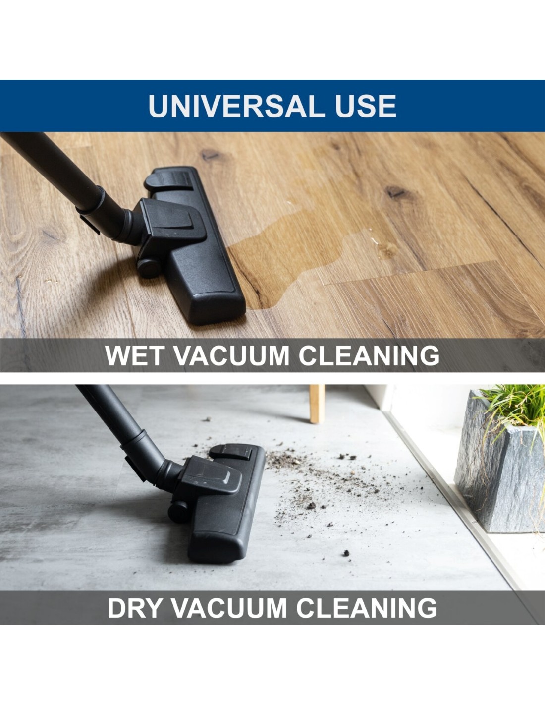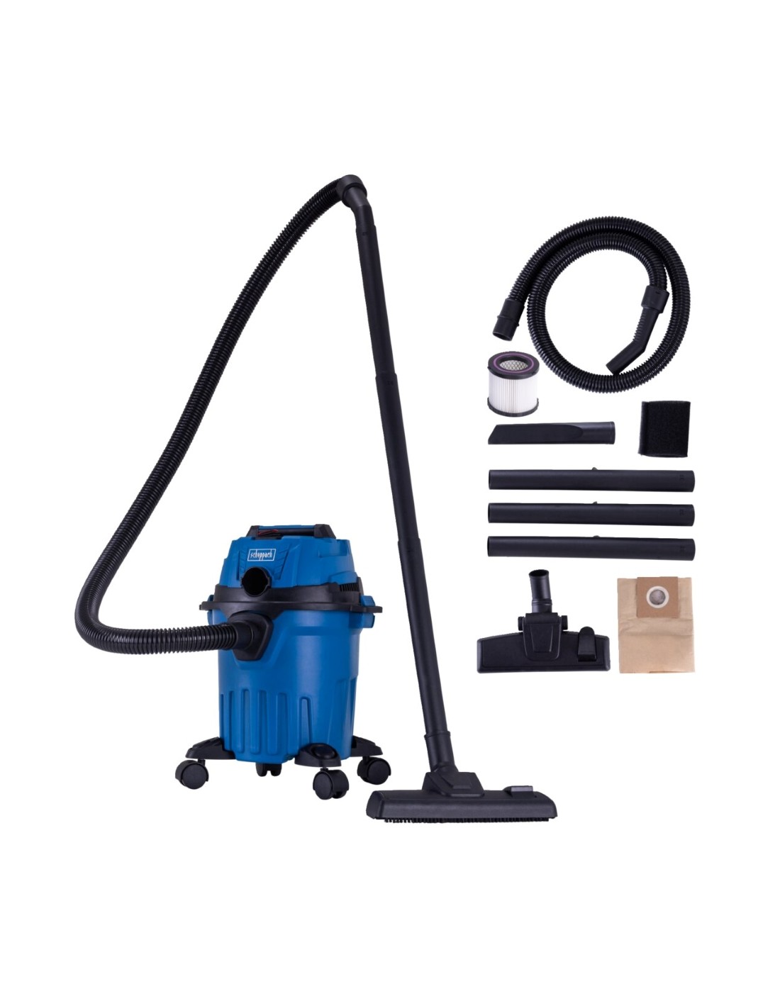 Aspirateur eau et poussière Scheppach c-nts15-x 20v série ixes ASPIRATEUR HUMIDE/SEC SANS FIL 12 L • Aspirateur eau et poussière compact, 10 kPa pour l'aspiration eau et poussière, avec fonction soufflerie d'air • Fonctionnement sans fil avec la série Scheppach IXES 20 volts – toutes les batteries et tous les chargeurs de cette série peuvent être combinés avec l'aspirateur eau et poussière sans fil • Bac de récupération robuste et incassable d'une capacité de 12 L 12 litres et fermeture rapide pour un changement de sac facile • Le filtre plissé lavable filtre même les plus petites particules de poussière - Grand rayon de travail grâce au tuyau de 1,5 m et aux 3 tubes rallonges en plastique supplémentaires - Support d'accessoires pratique pour un rangement propre et un travail soigné - La poignée et les 4 roues pivotantes à 360° permettent un transport facile - Comprend 3 tubes rallonges en plastique, un filtre plié, un sac en papier (certifié FSC), un filtre en mousse, une buse de sol, une buse pour fentes et un tube d'aspiration.