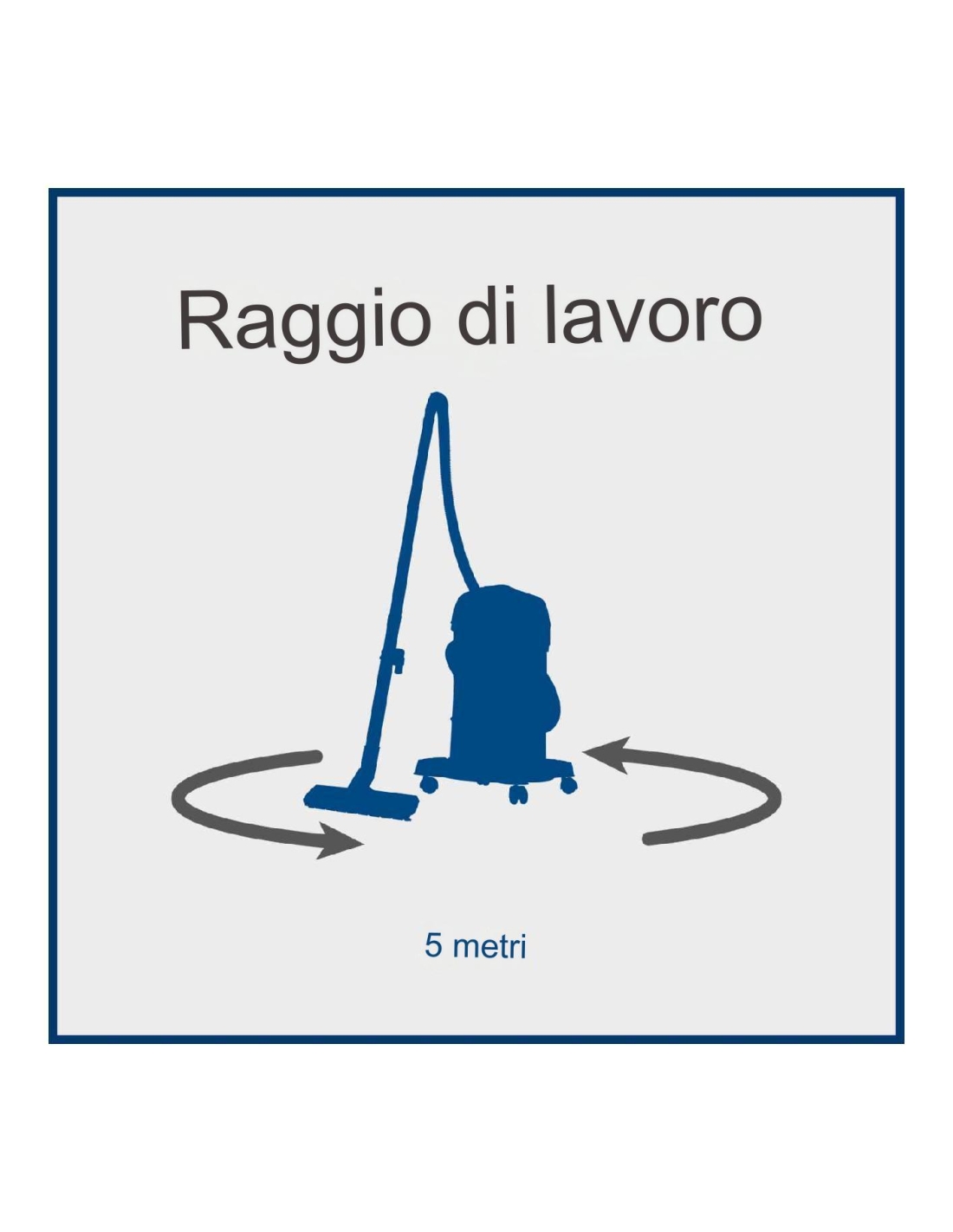 Un tuyau d'aspiration de 2 m de long se jette dans un tuyau d'aspiration métallique extensible d'un diamètre de 32 mm. Ensemble, cela donne un rayon de travail confortable d'environ 5 mètres. Les câbles et accessoires peuvent également être fixés directement sur l'aspirateur pour gagner de la place.