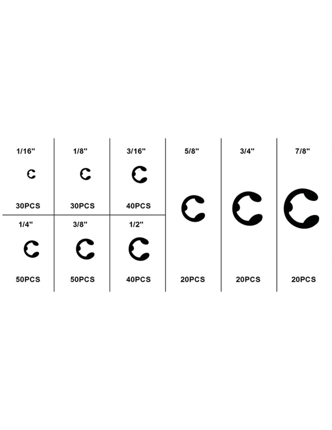 30 pièces 1/16" ; 30 pièces 1/8" ; 40 pièces 3/16" ; 50 pièces 1/4" ; 50 pièces 3/8" ; 40 pièces 1/2" ; 20 pièces 5/8" ; 20 pièces 3/4" ; 20 pièces 7/8" ; Ce lot contient 300 anneaux élastiques en acier trempé durable traité thermiquement avec une résistance à la traction accrue ; solides et durables. Les anneaux sont conçus pour s'adapter aux arbres et ne nécessitent aucune pince ni outil spécial pour l'assemblage. Ils peuvent être utilisés pour localiser ou empêcher les composants de bouger latéralement sur l'arbre. Ils peuvent également être utilisés pour le rainurage à la machine, adaptés à une utilisation en intérieur et en extérieur. Ils sont organisés par taille dans un étui transparent pour un accès rapide et une protection.