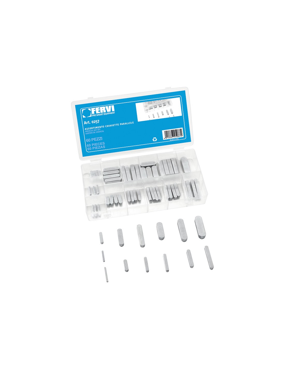 5 pièces 6x6x20 mm; 4 pièces 3x3x20 mm; 4 pièces 3x3x25 mm; 5 pièces 8x5x32 mm; 5 pièces 5x5x20 mm; 5 pièces 8x7x36 mm; 5 pièces 5x5x25 mm; 5 pièces 10x8x40 mm; 5 pièces 5x5x36 mm: 5 pièces 10x8x50 mm; 5 pièces 6x6x36 mm; 2 pièces 12x8x40 mm; 5 pièces 6x6x50 mm.
