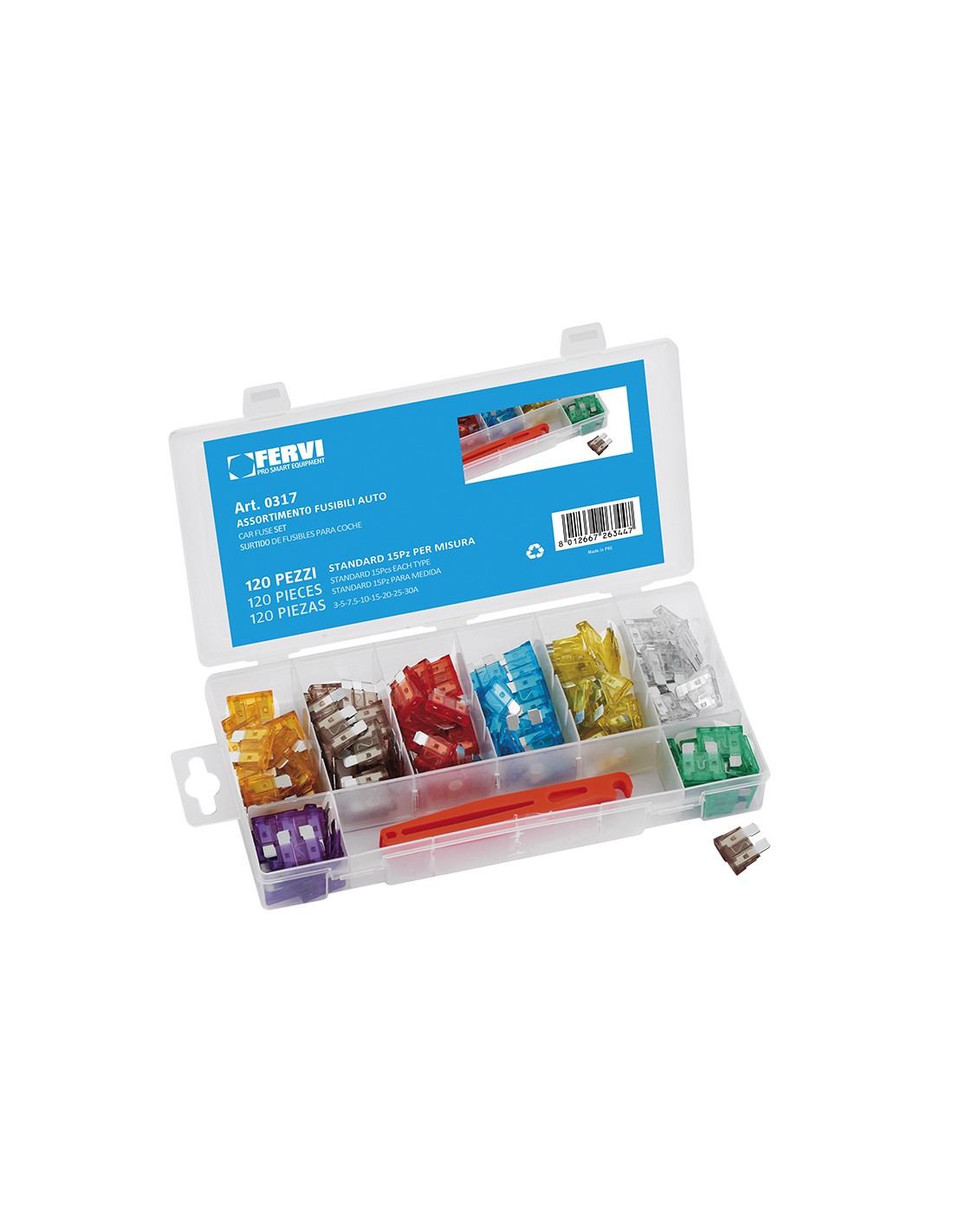 3A 15 pièces, 5A 15 pièces, 7,5A 15 pièces, 10A 15 pièces, 15A 15 pièces, 20A 15 pièces, 25A 15 pièces, 30A 15 pièces, Extracteur de fusible 1 pièce.