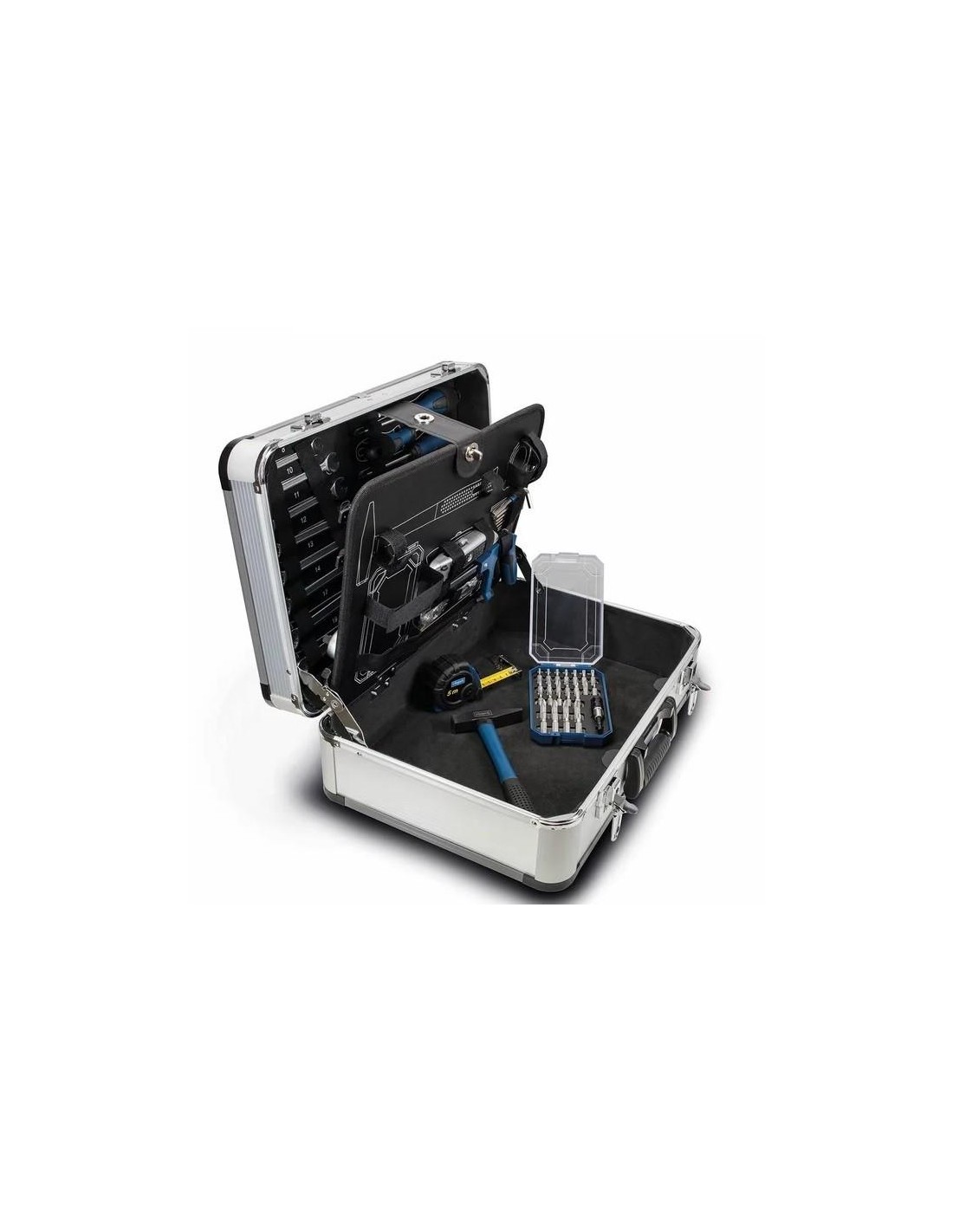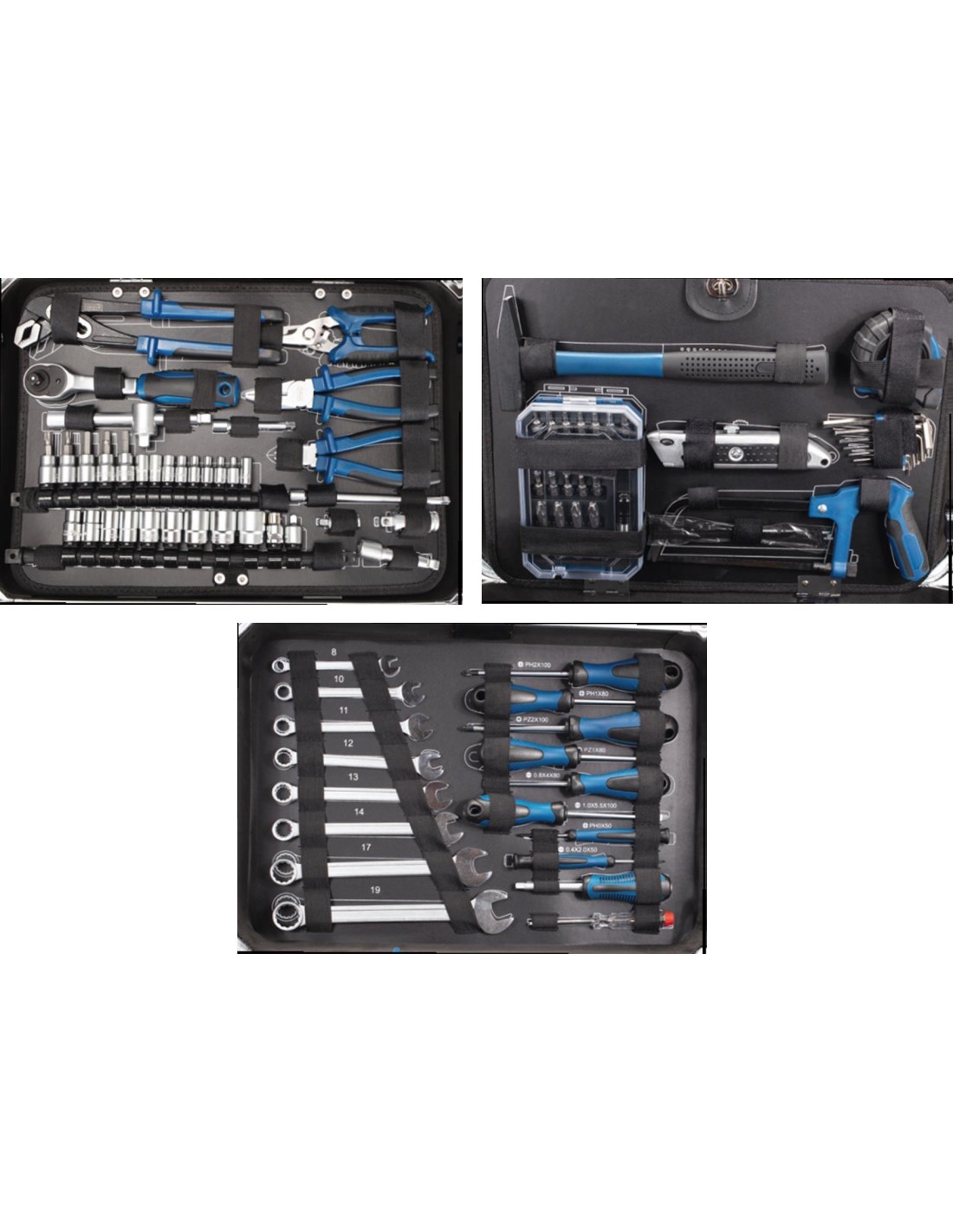 • L’ensemble comporte entre autres, une clé à cliquet réversible avec divers accessoires, une pince multiprise, une pince coupante, un couteau à lame trapézoïdale, un marteau, une scie, une cisaille, un détecteur de tension, un mètre à ruban, plusieurs clés à fourche, des tournevis, des clés Allen et des embouts de différentes tailles