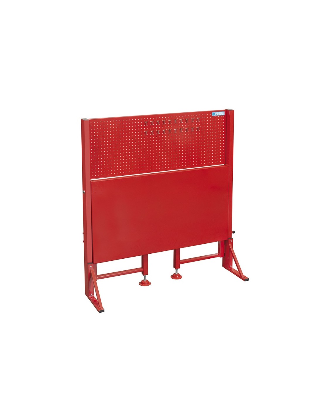 Fabriqué en acier, structure démontable avec 2 puissants vérins à gaz, panneau perforé 1195 x 458 x 20 mm, hauteur du pied principal 1380 mm, largeur totale du produit 1280 mm, profondeur du produit ouvert/fermé 648/130 mm à une hauteur de 330 mm, verrouillage automatique avec poignée dans le coin de la plaque supérieure, panneau perforé avec trous de diamètre 4 mm, distance entre les trous centraux 25 mm pour crochets avec fil de diamètre 3 mm.
