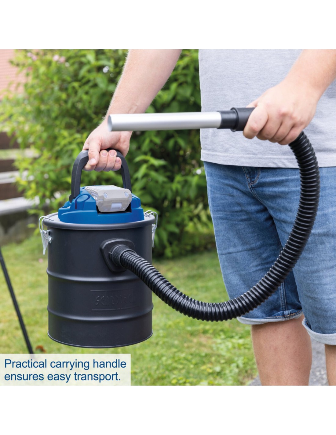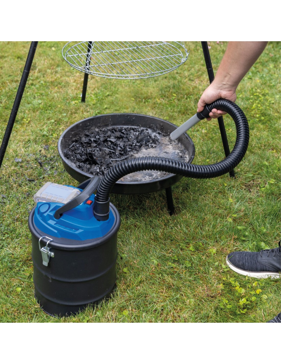 ASPIRATEUR DE CENDRES À BATTERIE 15 L • Aspirateur à cendres compact, avec une capacité d'aspiration de 10 kPa, assure un poêle à bois ou un barbecue propre • Travail sans fil avec la série Scheppach IXES 20 Volts – toutes les batteries et chargeurs de cette série de systèmes peuvent être combinés avec l'aspirateur à cendres sans fil • Collecteur métallique robuste d'une capacité de 15 L • Grand rayon d'action grâce au tube en aluminium ignifuge de 230 mm et au tuyau d'aspiration de 1000 m - Raccord de soufflage pour les zones de soufflage difficiles d'accès - Filtre plié pour les grosses saletés et les cendres - Le verrouillage rapide permet de vider facilement le collecteur - Poignée de transport pratique pour un transport facile