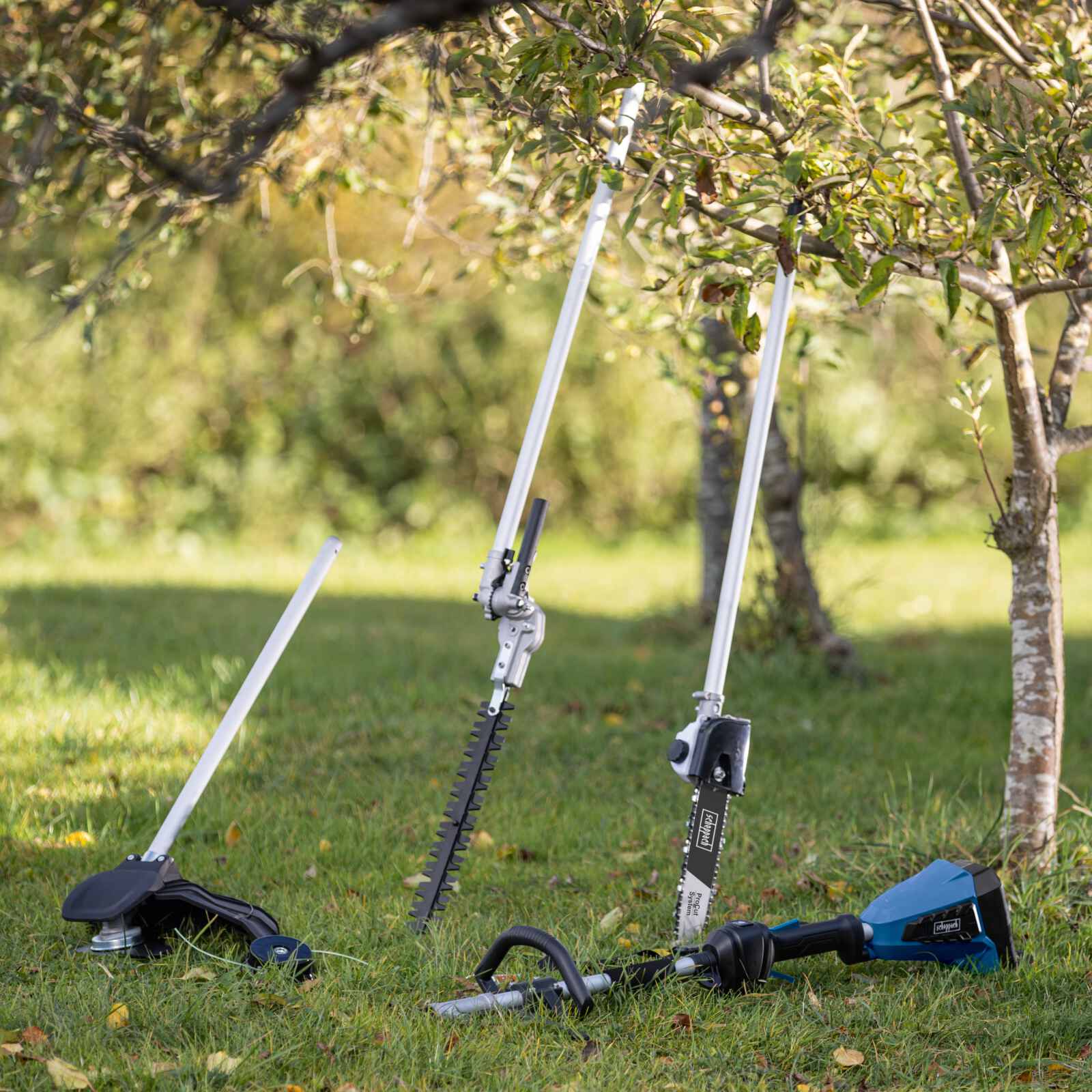 La gamme IXES 20V comprend également des dispositifs multifonction, comme le BC-MFH400-X, qui combine tondeuse, débroussailleuse, taille-haie et élagueuse sur perche en un seul outil. Le passage d'une fonction à l'autre est très simple et ne nécessite aucun outil. La vitesse est également réglable facilement via le panneau de commande.