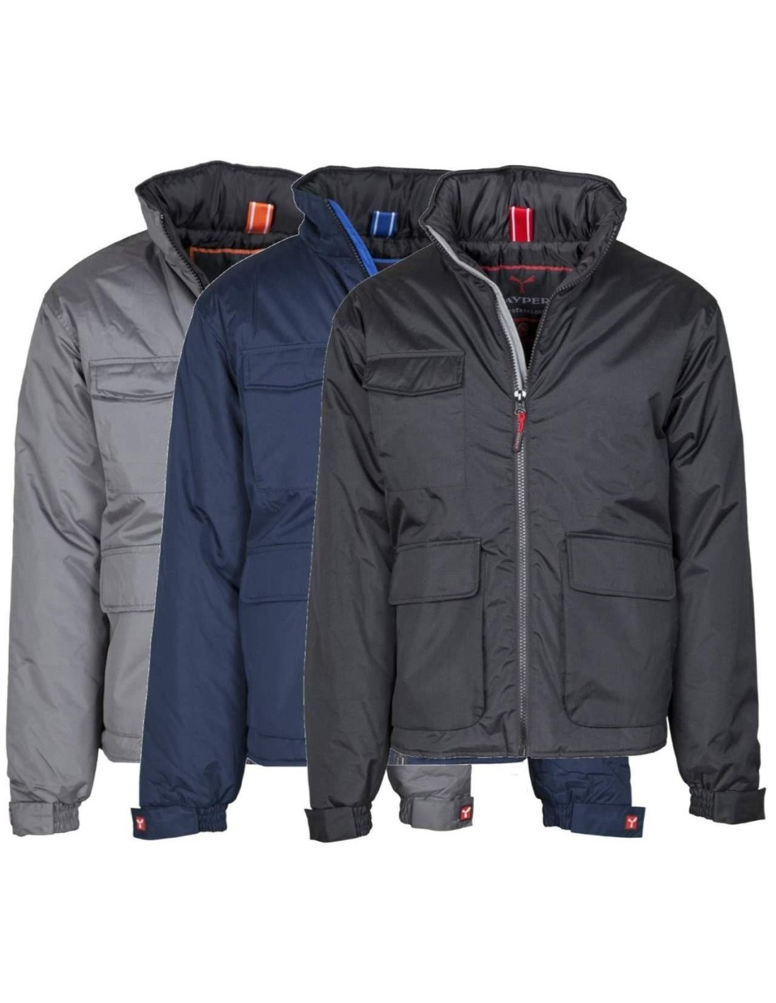 Veste manche fichées, élastique et poignettes, capuchon refermable dans le col; deux amples pochettes frontales LOCK-SYSTEM, deux pochettes latérales, porte téléphone mobile dans la poitrine, interne rembourré, fermeture à glissière sur le dos pour faciliter impression et broderie.