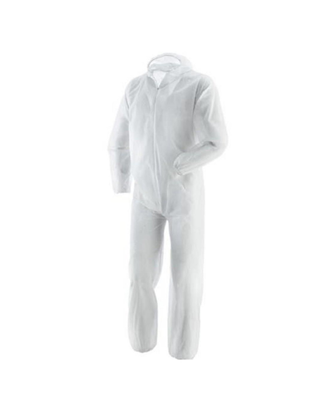 Combinaison de protection, à usage unique, en « tissu non tissé », dotée de capuche, élastiques serre-poignet, serre-cheville et serre-taille, fermeture par zip sur le devant. Paquet de 50 pièces.