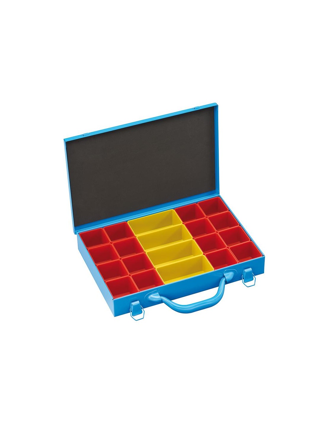Avec 16 petits plateaux amovibles en plastique et 4 plateaux moyens, idéal pour le stockage de petites pièces. Dimensions des petits plateaux en plastique : 54 x 52 x 43h mm, dimensions des plateaux moyens en plastique : 54 x 105 x 43h mm. La boîte est dotée de deux serrures de sécurité pour éviter le renversement involontaire du matériel.