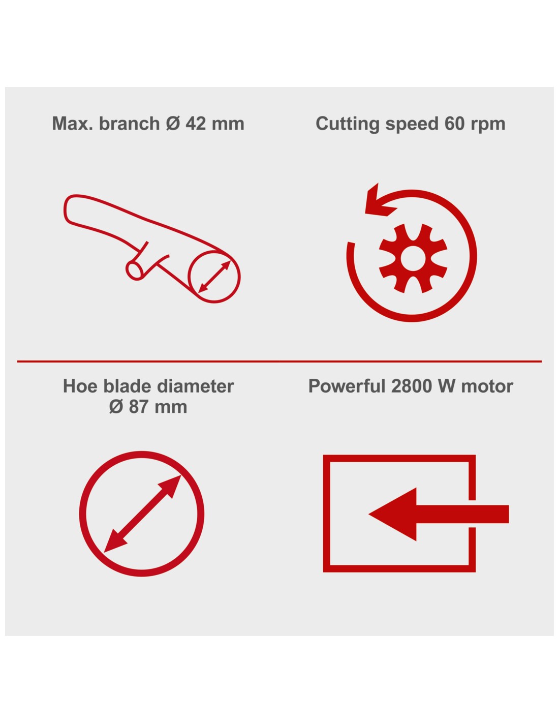 • Broyeur compact et silencieux, doté d'une fonction 2 en 1, pour le broyage et la collecte des déchets verts, arbustes et arbustes jusqu'à 42 mm d'épaisseur.