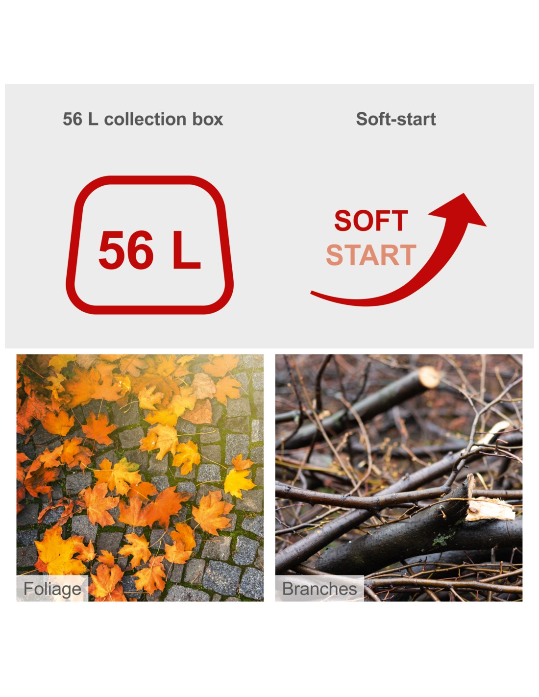 • Bac de ramassage robuste de 56 L avec levier de verrouillage pour un arrêt de sécurité lors du retrait.