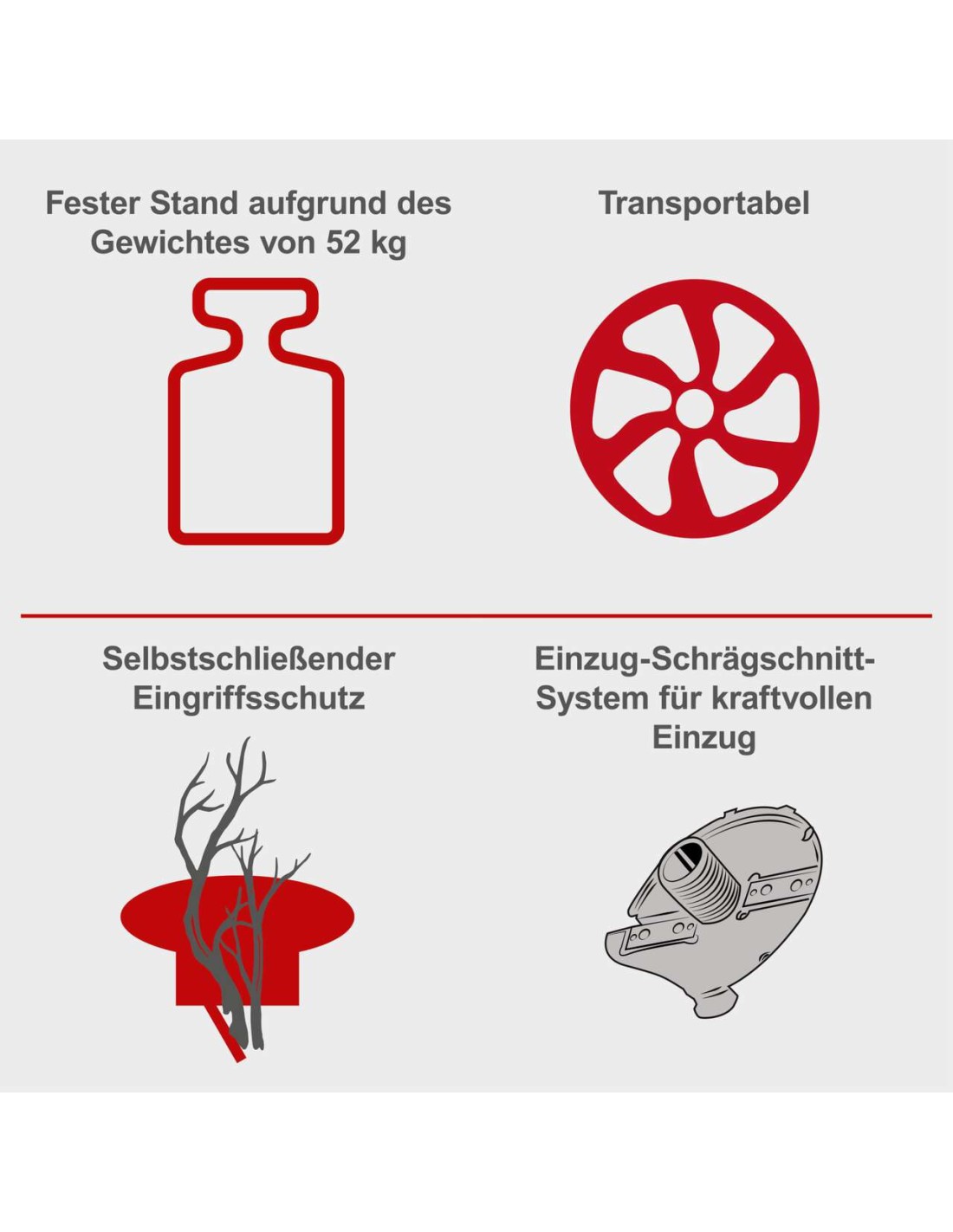 Le moteur à induction de 3000 watts assure une performance continue. Le BIOSTAR 3000 broie 120 kg de branches d'un diamètre maximal de 45 mm ou 150 kg de broussailles en une heure, et ce, si rapidement qu'il n'y a pas d'attente pour le remplissage. Les personnes privilégiant l'efficacité apprécieront le BIOSTAR 3000. L'ouverture d'alimentation de 120 x 155 mm est dotée d'un dispositif de sécurité à fermeture automatique. La grande ouverture d'évacuation de 385 x 60 mm expulse rapidement les déchets broyés. Deux grandes roulettes sont montées sur le robuste carter métallique du broyeur de jardin BIOSTAR 3000. Ces roulettes et la poignée de transport intégrée à la trémie d'alimentation permettent un déplacement confortable. Le carter est également doté d'un système de verrouillage centralisé. La construction à trois couches se compose d'un revêtement extérieur et d'une tôle à carreaux à l'intérieur, séparés par un tapis isolant pour réduire le bruit.