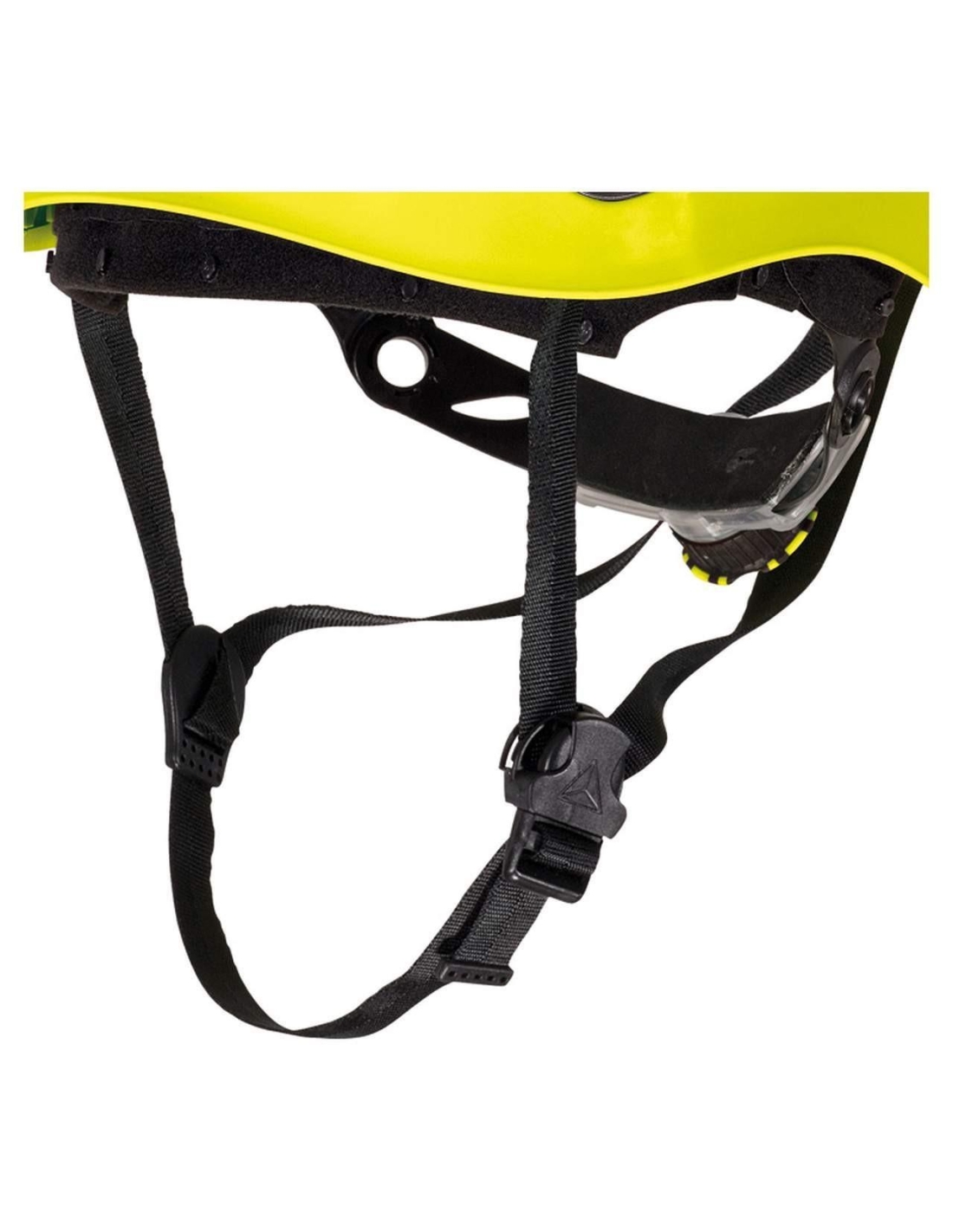 DESCRIPTION Casque de chantier en ABS. Style casque de montagne : sans visière pour une meilleure vision verticale. Très peu d’encombrement. Léger. Coiffe polyamide : 3 bandeaux textiles avec 8 points de fixation. Basane thermoformée. Système de serrage ROTOR® (breveté) ajustable : tour de tête de 53 à 63 cm. Vendu avec jugulaire 3 points de fixation. Spécialement conçu pour les travaux en hauteur. Isolement électrique jusqu’à 1000 VAC ou 1500 VCC.