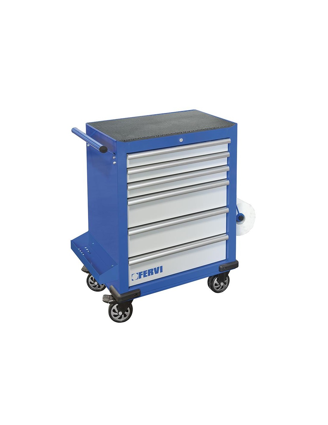 Poignée latérale, plan de travail en polypropylène expansé, corps en tôle d'acier avec pare-chocs antichoc et parois latérales perforées, 6 tiroirs à sortie totale avec tapis anti-huile, montés sur glissières télescopiques à billes, dispositif anti-basculement, fermeture centralisée latérale fournie avec 2 clés rabattables, 2 roulettes fixes et 2 pivotantes avec frein. Accessoires en option : porte-tournevis, porte-documents, étagère, porte-rouleau de papier, panneau arrière perforé et plateau laminé.
