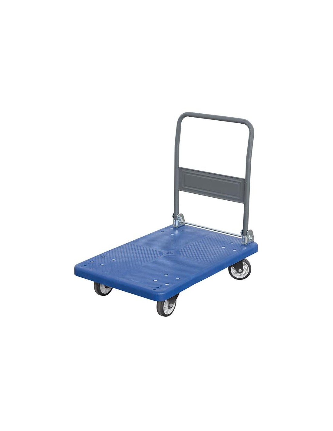 Avec poignée pliable, 2 roulettes fixes et 2 roulettes pivotantes.