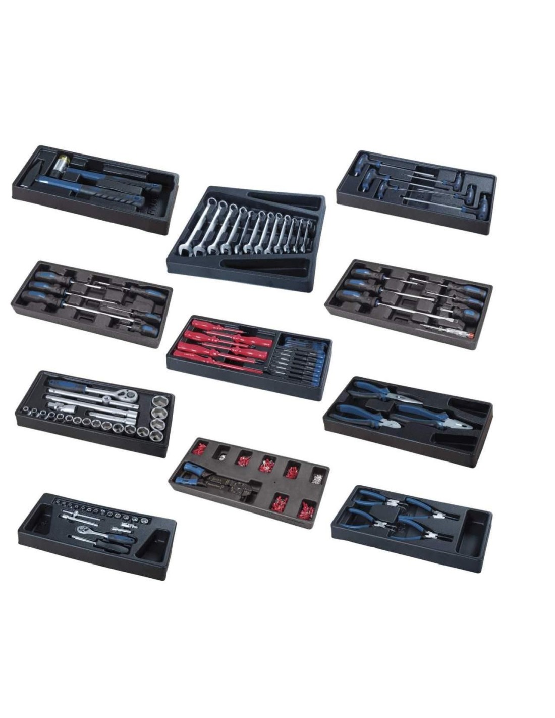 - 6 fentes pour tournevis (1 testeur de phase, 4 x 100, 5 x 100, 3 x 75, 6 x 150, 6 x 38, 8 x 200)