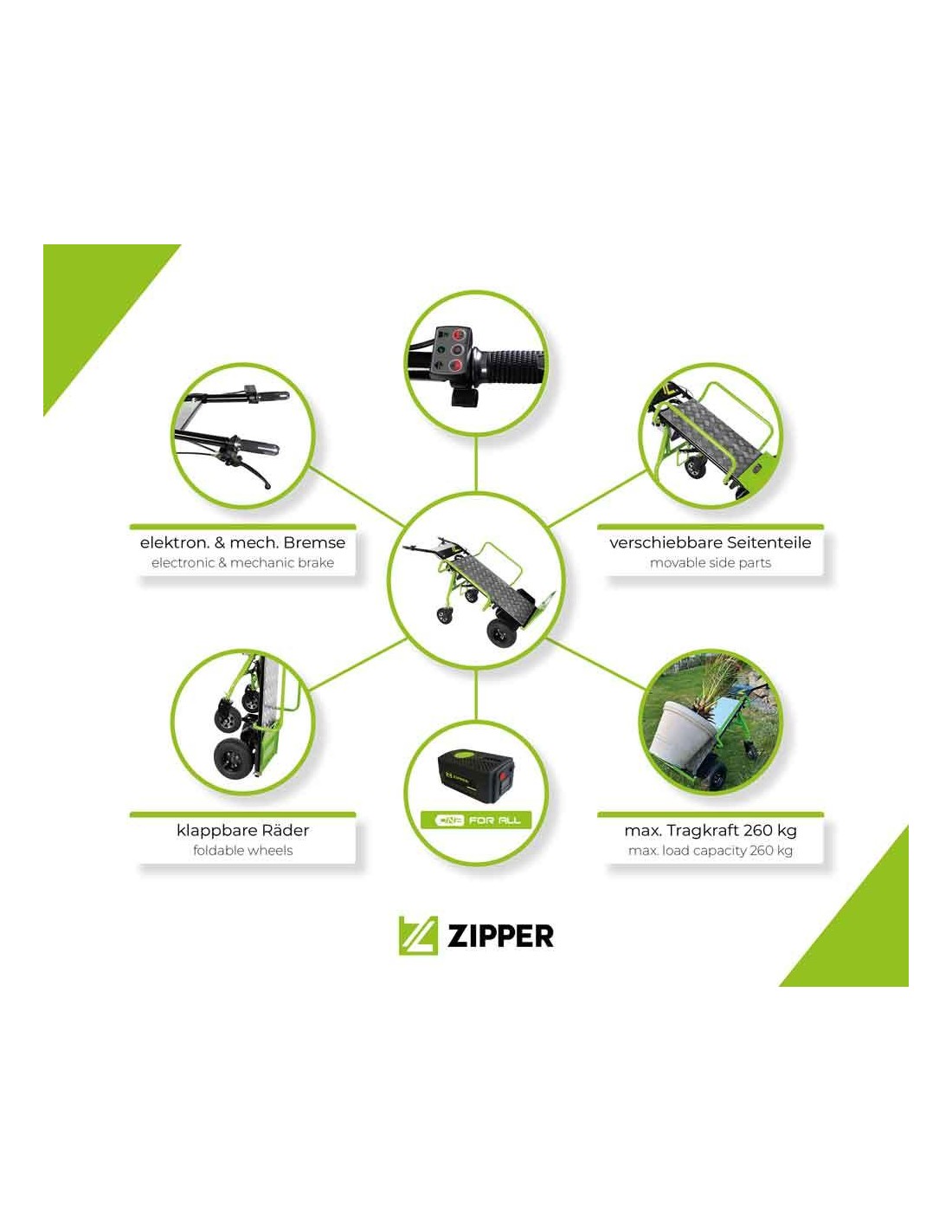 Le chariot électrique ZIPPER ZI-ET260 est idéal pour transporter des marchandises dans la maison, dans le jardin et dans la cour ou partout où vous avez besoin d'un support pour transporter des marchandises lourdes jusqu'à 260 kg. Le ZI-ET260 fait partie de la série ONE-FOR-ALL et donc la batterie est compatible avec une large gamme d'outils ZIPPER (tronçonneuse/coupe-bordures/tondeuse/souffleur de feuilles,...).