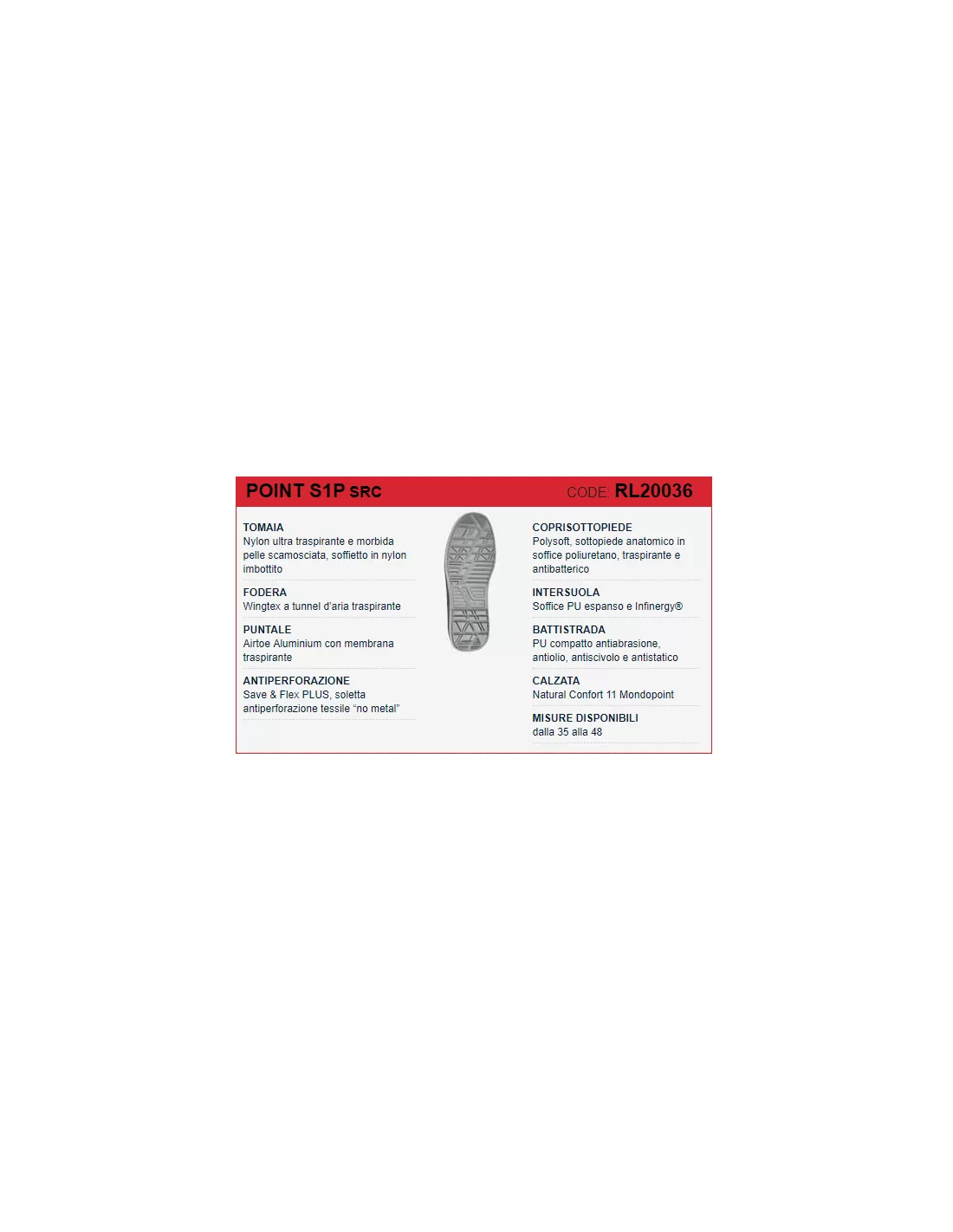 Cette chaussure est conforme aux normes de sécurité EN ISO 20345 S1P SRC et convient aux environnements secs, au transport, à la logistique, au secteur tertiaire et des services.