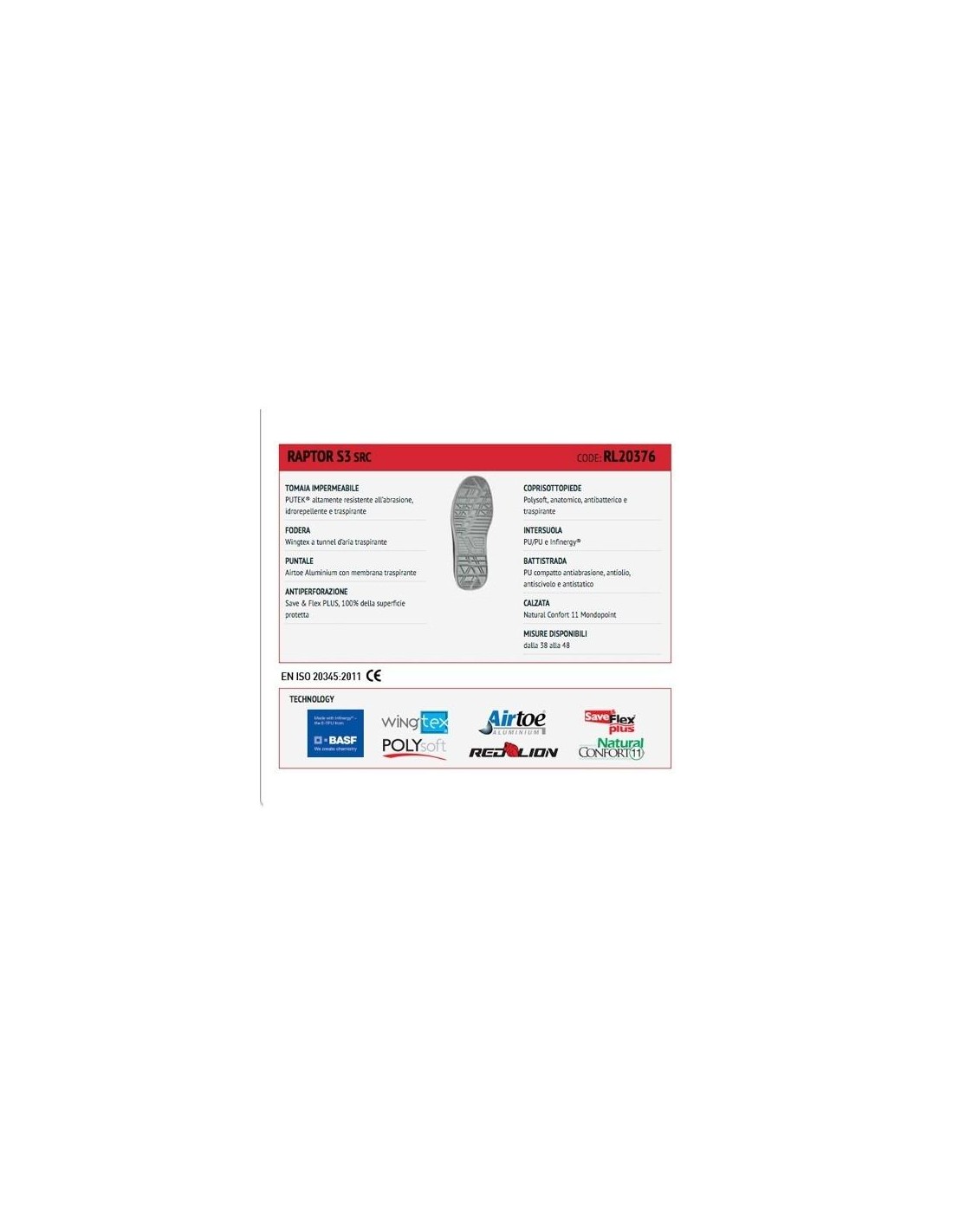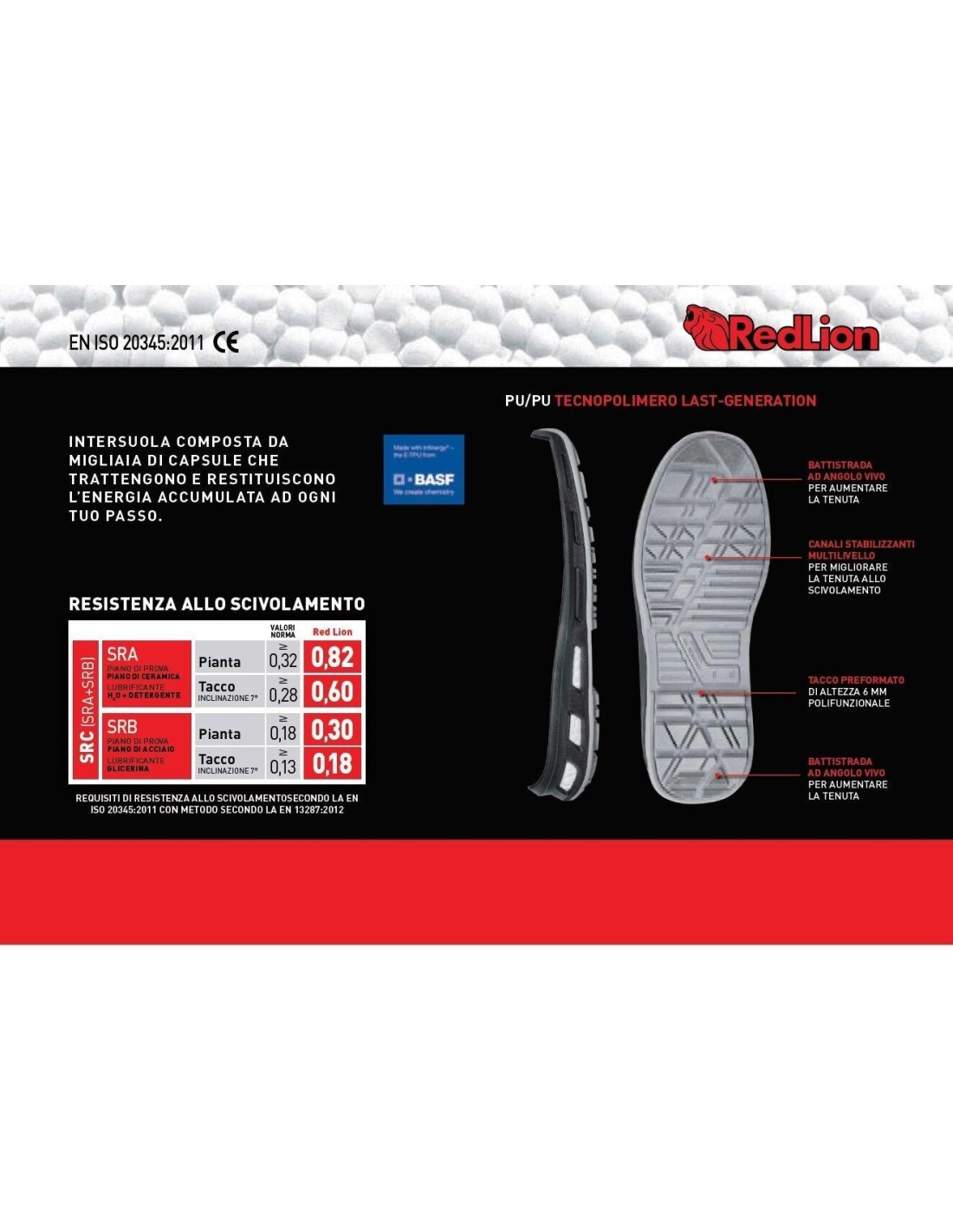 Chaussures de sécurité RedLion®, avec embout en aluminium AirToe® et système antiperforation Save & Flex PLUS, conçues pour garantir un bien-être prolongé du pied. Légeres, confortables, avec tige en Putek® à haute résistance à l'abrasion, fermeture par lacets et soufflet en nylon matelassé pour un confort durable. Ces chaussures de travail sont capables de garantir confort et légèreté grâce à la semelle dotée de système Infinergy® innovant et à la semelle intermédiaire en polyuréthane expansé. Le talon multifonctionnel et la bande de roulement compacte en PU garantissent adhérence, sécurité et stabilité de la posture. Cette chaussure est conforme aux normes de sécurité S3 SRC et convient à une utilisation dans les environnements humides, le transport et la logistique, le secteur tertiaire et des services.
