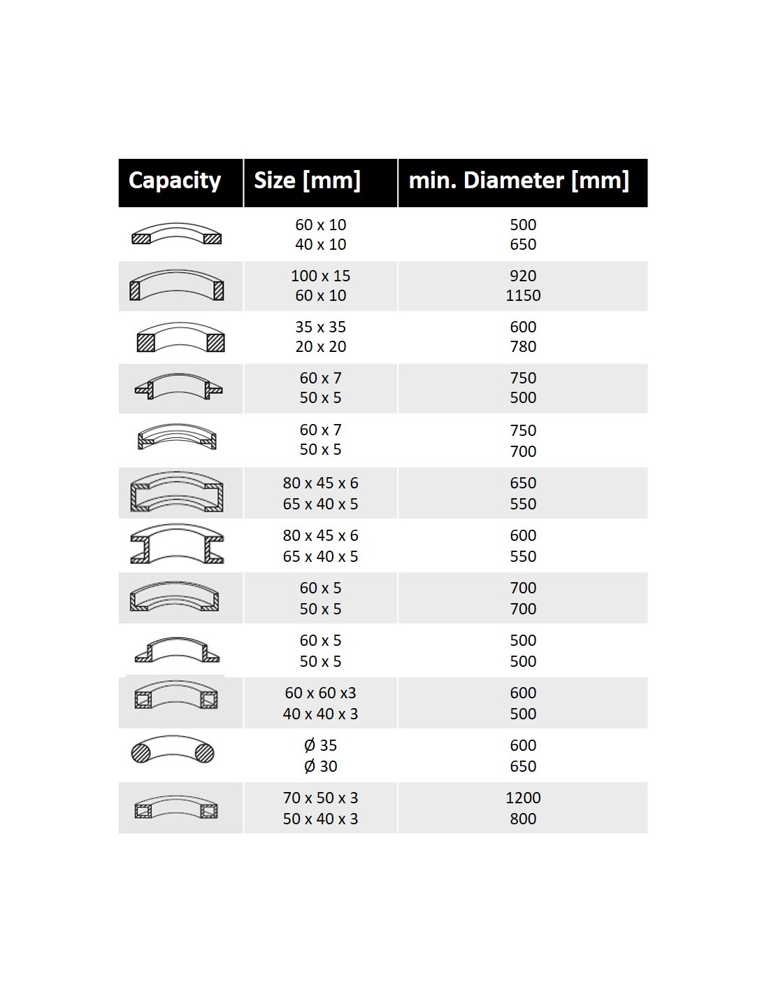 Rayon de cintrage réglable grâce au dispositif d'avance supérieur avec vernier. Convient au cintrage de profilés et de tubes. Les galets universels permettent de cintrer de nombreuses géométries de profilés. Poids propre très élevé pour une stabilité optimale, galets de redressement latéraux rectifiés et trempés. Galets de cintrage en acier trempé et durable. Commande au pied, rotation gauche-droite.