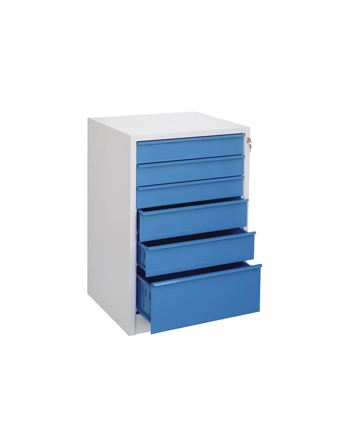 Avec 6 tiroirs, coulissants sur roulement avec dispositif de blocage, sans séparateurs intérieurs.