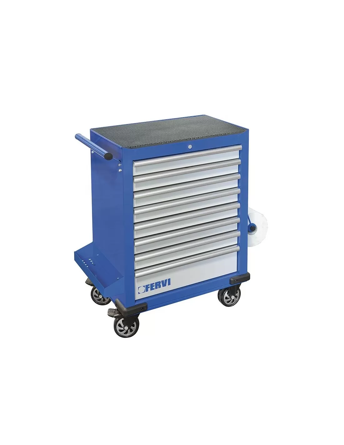 Poignée latérale, plan de travail en polypropylène expansé, corps en tôle d'acier avec pare-chocs antichoc et parois latérales perforées, 8 tiroirs à sortie totale avec tapis anti-huile, montés sur glissières télescopiques à billes, dispositif anti-basculement, fermeture centralisée frontale fournie avec 2 clés rabattables, 2 roulettes fixes et 2 pivotantes avec frein. Accessoires en option : porte-tournevis, porte-documents, étagère, porte-rouleau de papier, panneau arrière perforé et plateau laminé.