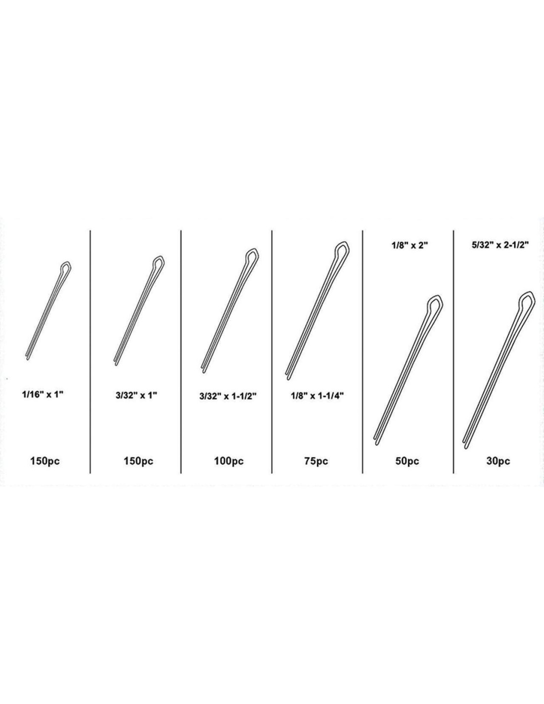 150 pièces 1/16" x 1"; 150 pièces 3/32" x 1"; 100 pièces 3/32" x 1 - 1/2"; 1/8"x1-1/4"; 50 pièces 1/8" x 2"; 30 pièces 5/32"x2-1/2".