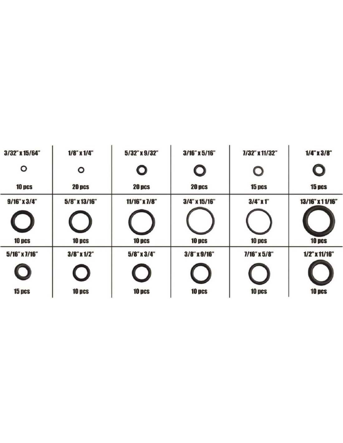 10 pièces 3/32" x 15/64"; 20 pièces 1/8" x 1/4"; 20 pièces 5/32" x 9/32"; 20 pièces 3/16" x 5/16"; 15 pièces 7/32" x 11/32"; 15 pièces 1/4" x 3/8"; 10 pièces 9/16" x 3/4"; 10 pièces 5/8" x 13/16"; 10 pièces 11/16" x 7/8"; 10 pièces 3/4" x 15/16"; 10 pièces 3/4" x 1"; 10 pièces 13/16" x 11/16"; 15 pièces 5/16" x 7/16"; 10 pièces 3/8" x 1/2"; 10 pièces 5/8" x 3/4"; 10 pièces 3/8" x 9/16"; 10 pièces 7/16" x 5/8"; 10 pièces 1/2" x 11/16".