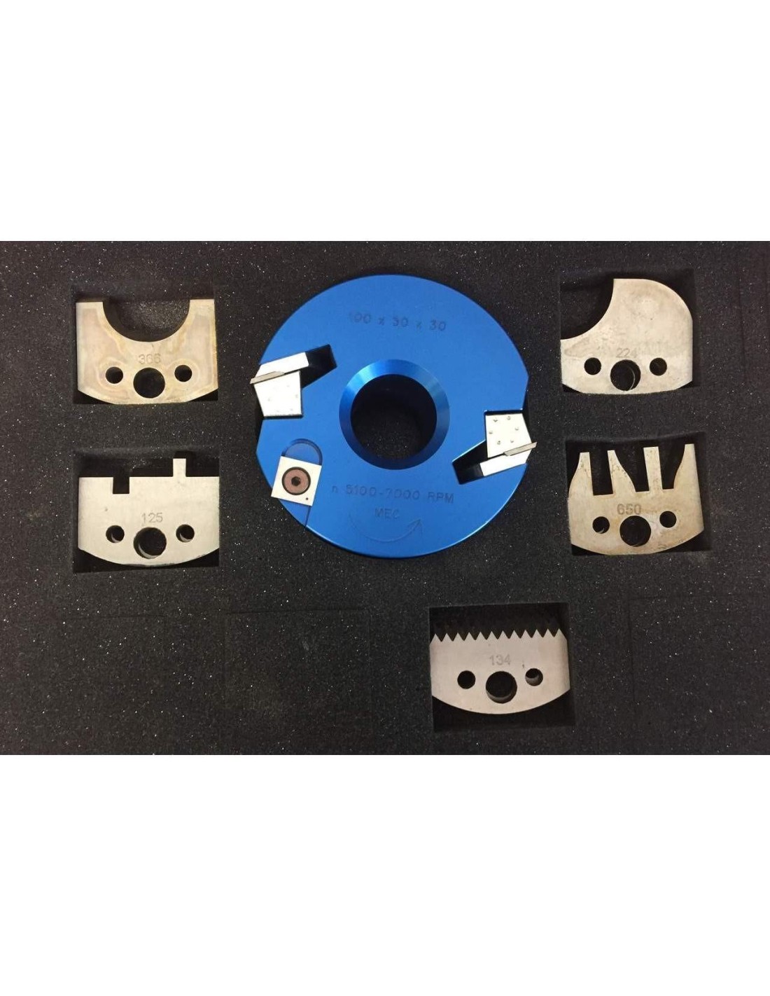 -1 coffre porte-outils en aluminium ø 100x50x5,5 mm trou ø 30 avec HM couteaux droit et araseur + 5 pair de couteaux profilés de 50 mm de hauteurs et 5,5 mm d’épaisseur