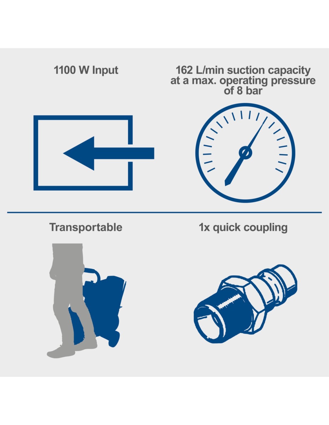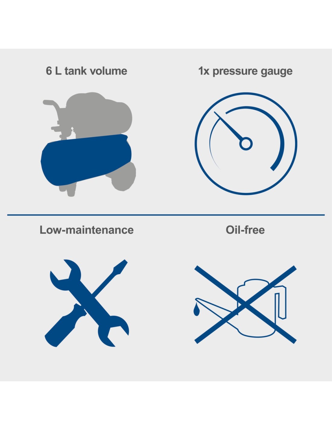 COMPRESSEUR ULTRA SILENCIEUX 6 L - Compresseur compact - utilisable universellement pour les travaux à la maison, à l'atelier ou au garage - Taille de la chaudière 6 L - Moteur puissant de 1100 W - Réducteur de pression pour un contrôle optimal de la pression de fonctionnement - Raccord rapide pour un changement rapide d'outil - Pression maximale de fonctionnement 8 bar - Le double cylindre assure une grande capacité d'aspiration et un remplissage rapide de la chaudière - Compresseur sans huile pour une longue durée de vie et un faible entretien - 162 L/min Puissance d'aspiration • Pieds en caoutchouc anti-vibrations pour un stationnement antidérapant et fonctionnement silencieux et à faibles vibrations • Faible niveau sonore de 67,4 dB(A)* *Les niveaux sonores peuvent varier en fonction de la proximité et de l'emplacement et ont été mesurés à 7 mètres du panneau de commande