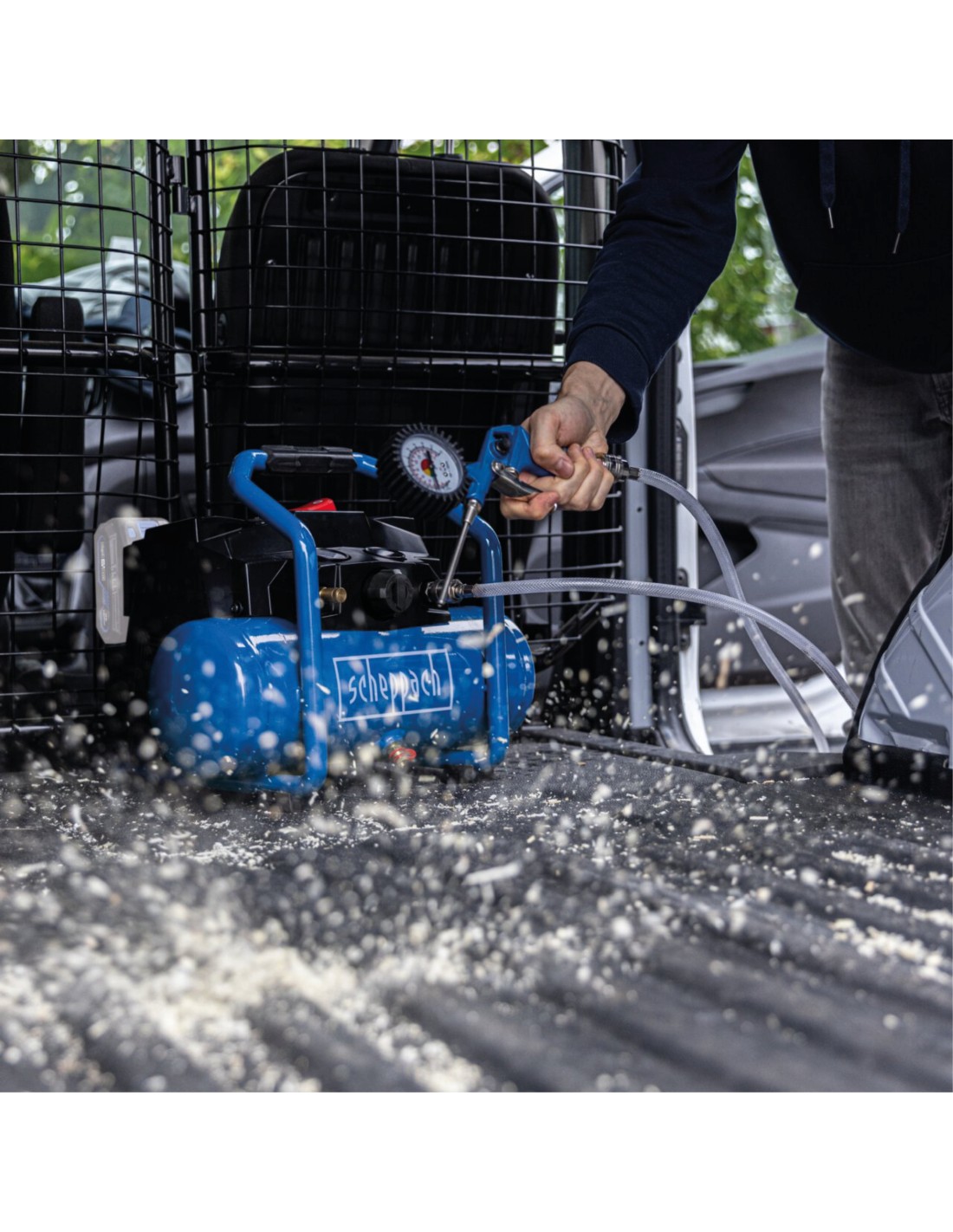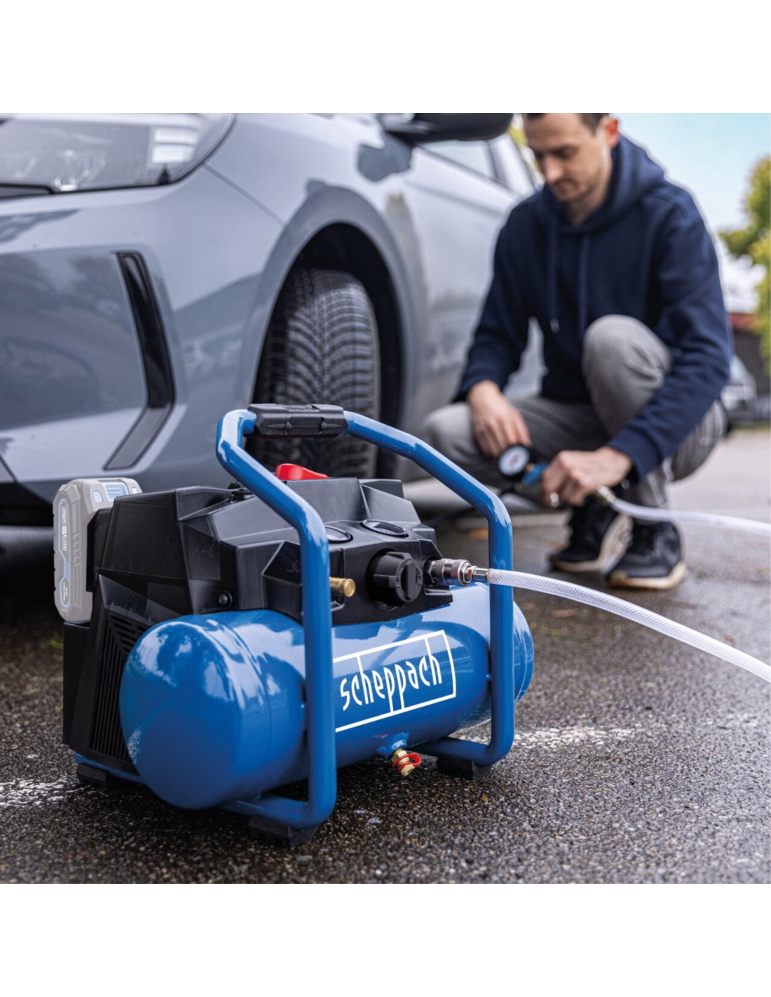 COMPRESSEUR DE BATTERIE - Compresseur de batterie puissant - idéal pour une utilisation mobile et pour le travail à la maison, à l'atelier ou au garage - Fonctionnement sur batterie avec la série Scheppach IXES 20 Volts - toutes les batteries et chargeurs de la série système peuvent être combinés avec le compresseur de batterie - Taille de chaudière 6 L - Puissant 2x 20 V (40 V) - Réducteur de pression et 2 manomètres pour un contrôle optimal de la pression de fonctionnement - Raccord rapide pour un changement rapide d'outil - Pression de travail maximale 8 bar - Compresseur sans huile pour longue durée de vie et faible entretien - Capacité d'aspiration de 150 L/min - Pieds en caoutchouc anti-vibrations pour un stationnement antidérapant et un travail silencieux et sans vibrations - Conception ergonomique et compacte avec poignée souple pour un confort d'utilisation élevé - Batterie et chargeur disponibles séparément - Comprend un jeu d'accessoires de 11 pièces et un tuyau en tissu de 2,5 m