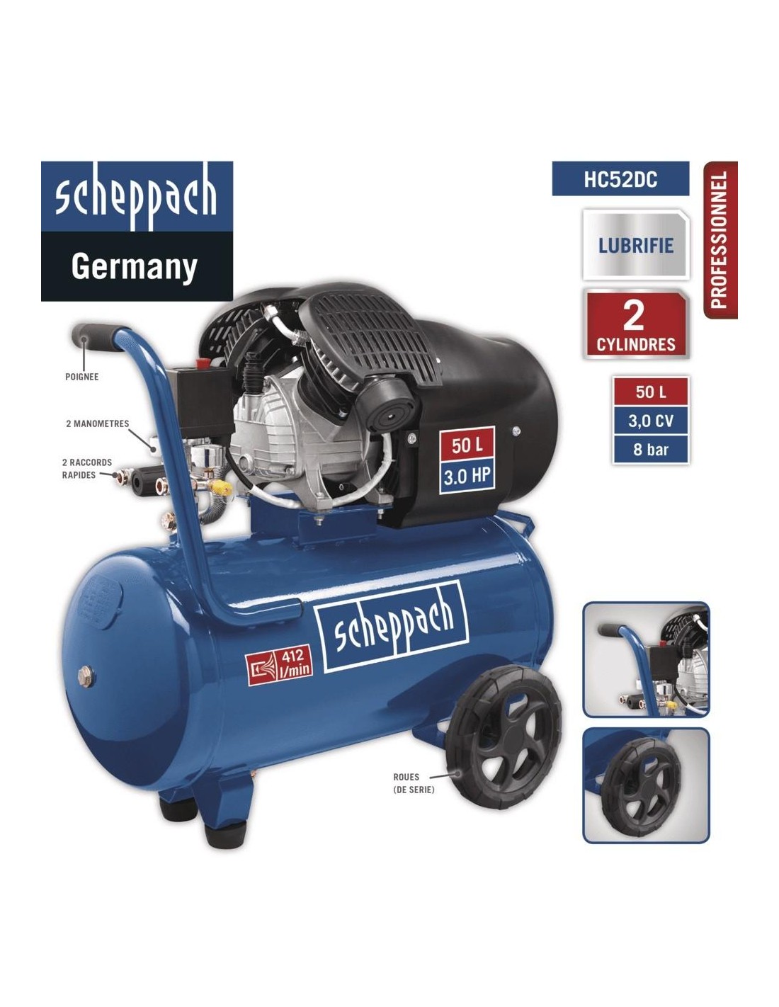 COMPRESSEUR D'AIR 50 LT HUILE-LUBRIFIÉ SCHEPPACH HC52DC: