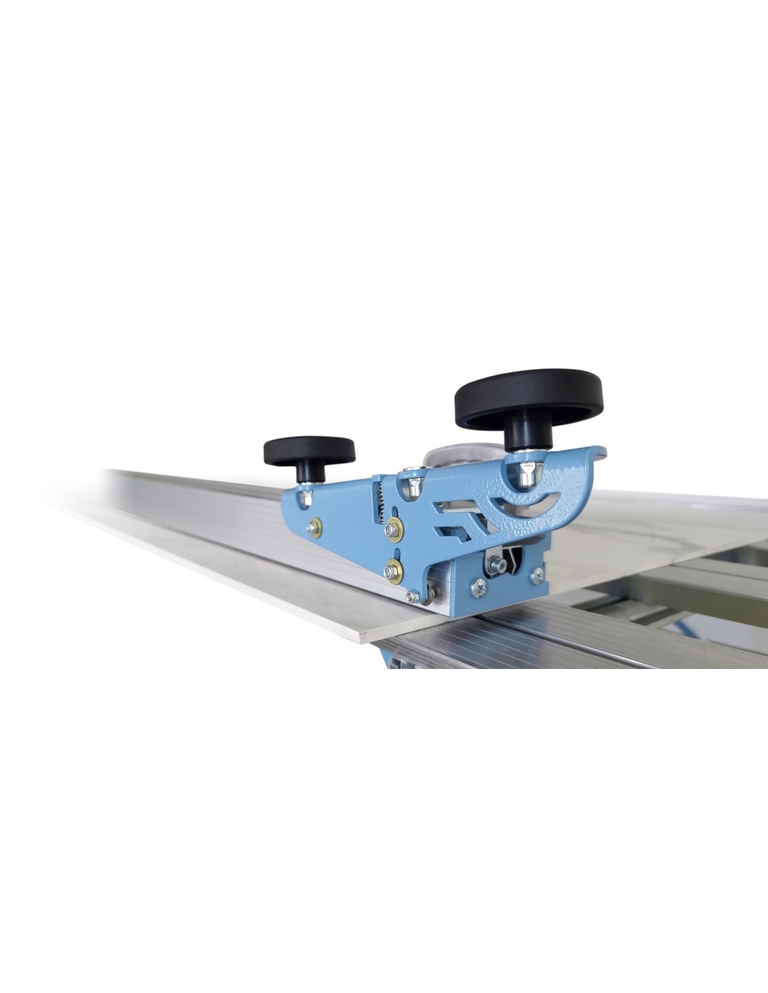 Le guide en aluminium, fixé au carreau au moyen de ventouses 51F (antitaches, positionnables librement, également adaptées aux surfaces rugueuses), permet le coulissement du chariot avec la molette de gravure.