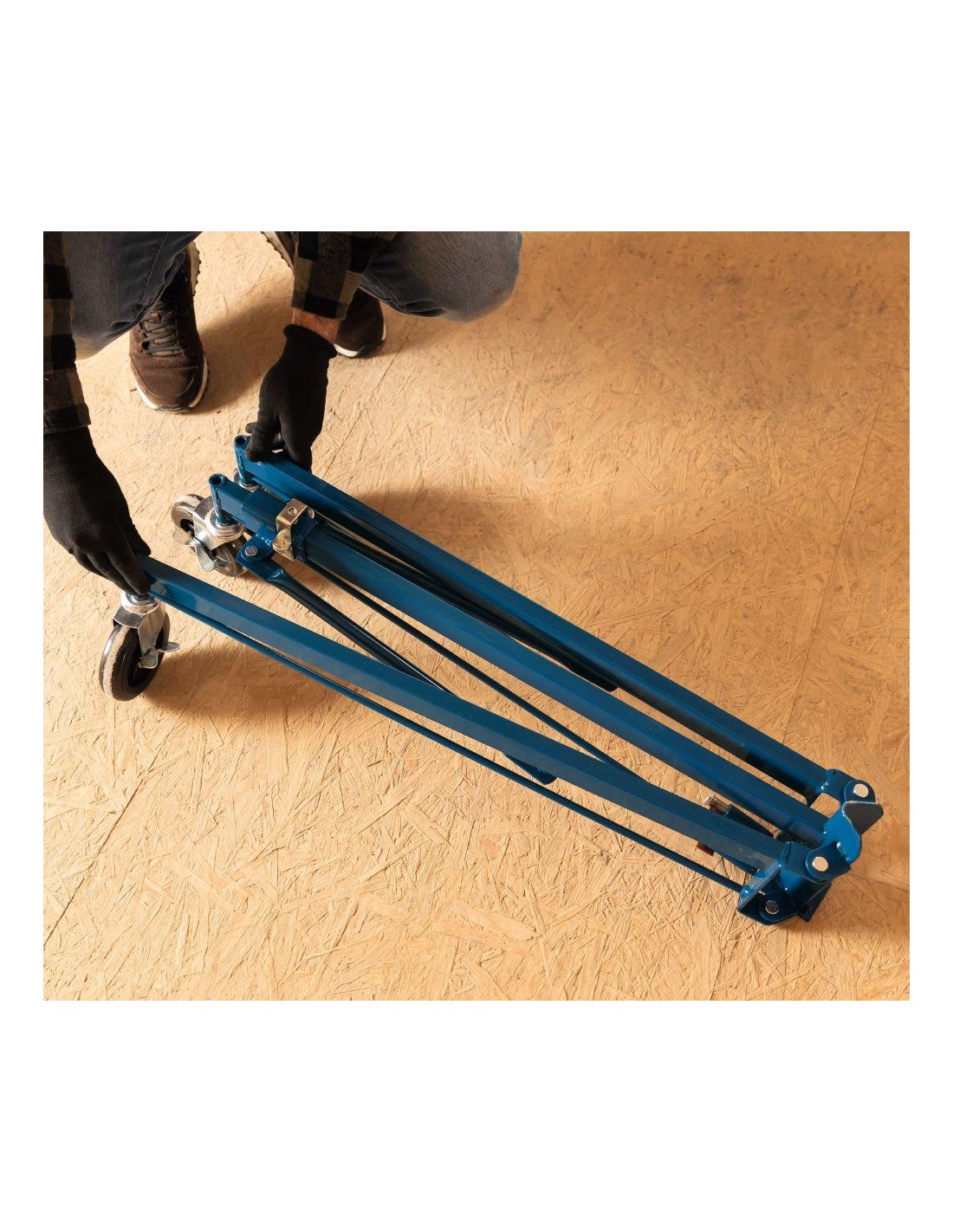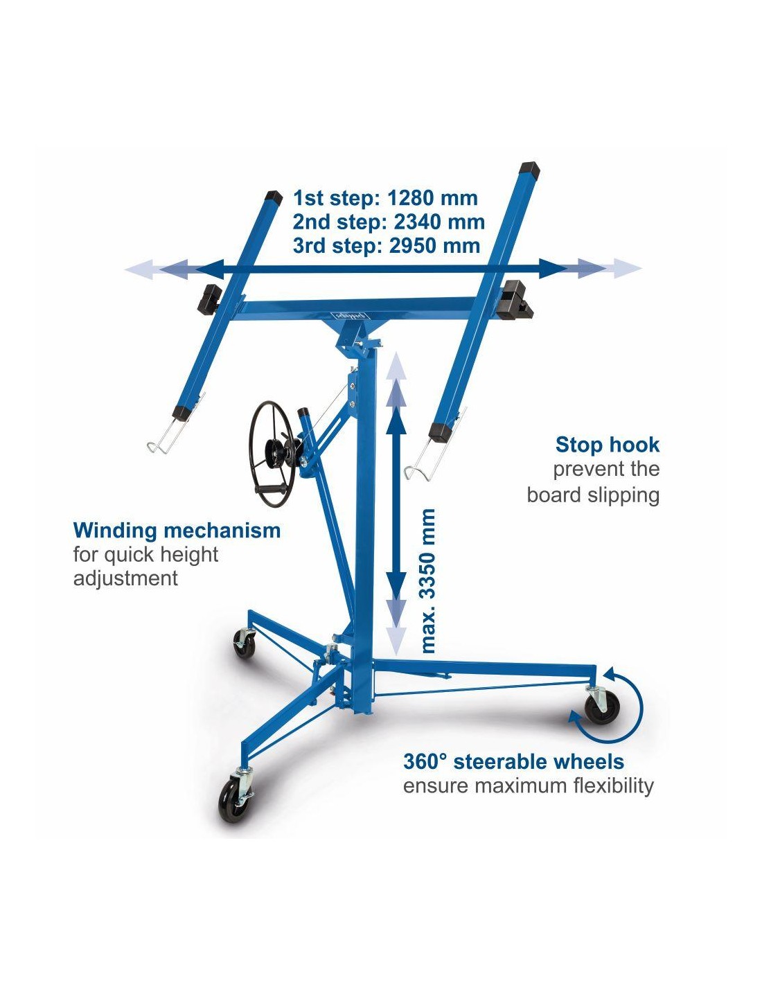 L'élévateur pour cloisons sèches Scheppach TBL400 est l'aide au montage optimale pour les travaux en hauteur dans l'aménagement intérieur ou la construction de cloisons sèches. À l'aide du TBL400, des plaques de plâtre, des panneaux de particules, des panneaux de bois et de métal jusqu'à un poids maximum de 68 kg peuvent être fixés sans effort. La grande plage de levage de 1 220 mm à 3 350 mm et les deux bras d'extension extensibles avec une extension en trois étapes (1 280 / 2 340 / 2 950 mm) garantissent une utilisation flexible. Le lève-panneaux est inclinable à 60° et convient donc également aux plafonds et murs inclinés.