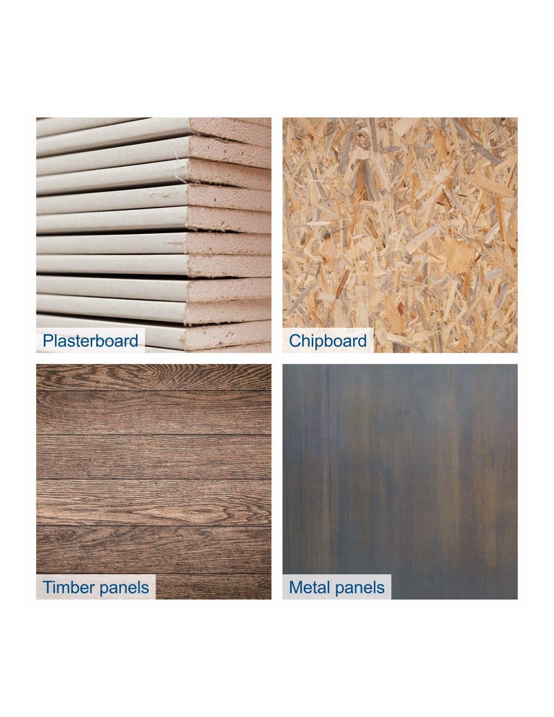 telles que des plaques de plâtre, des panneaux de particules, des panneaux de bois et de métal