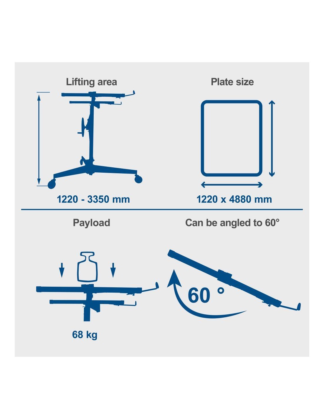 - Équipé de 3 roues avec frein, pivotant à 360 degrés, permettant de déplacer rapidement et facilement le lève plaques dans la zone de travail