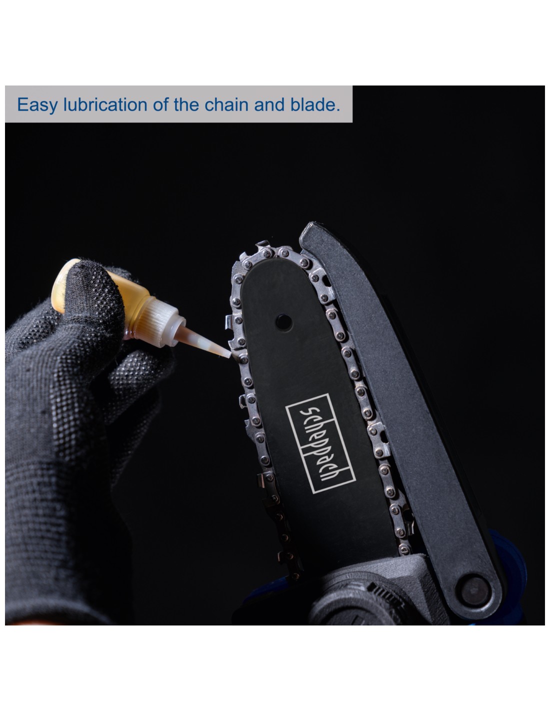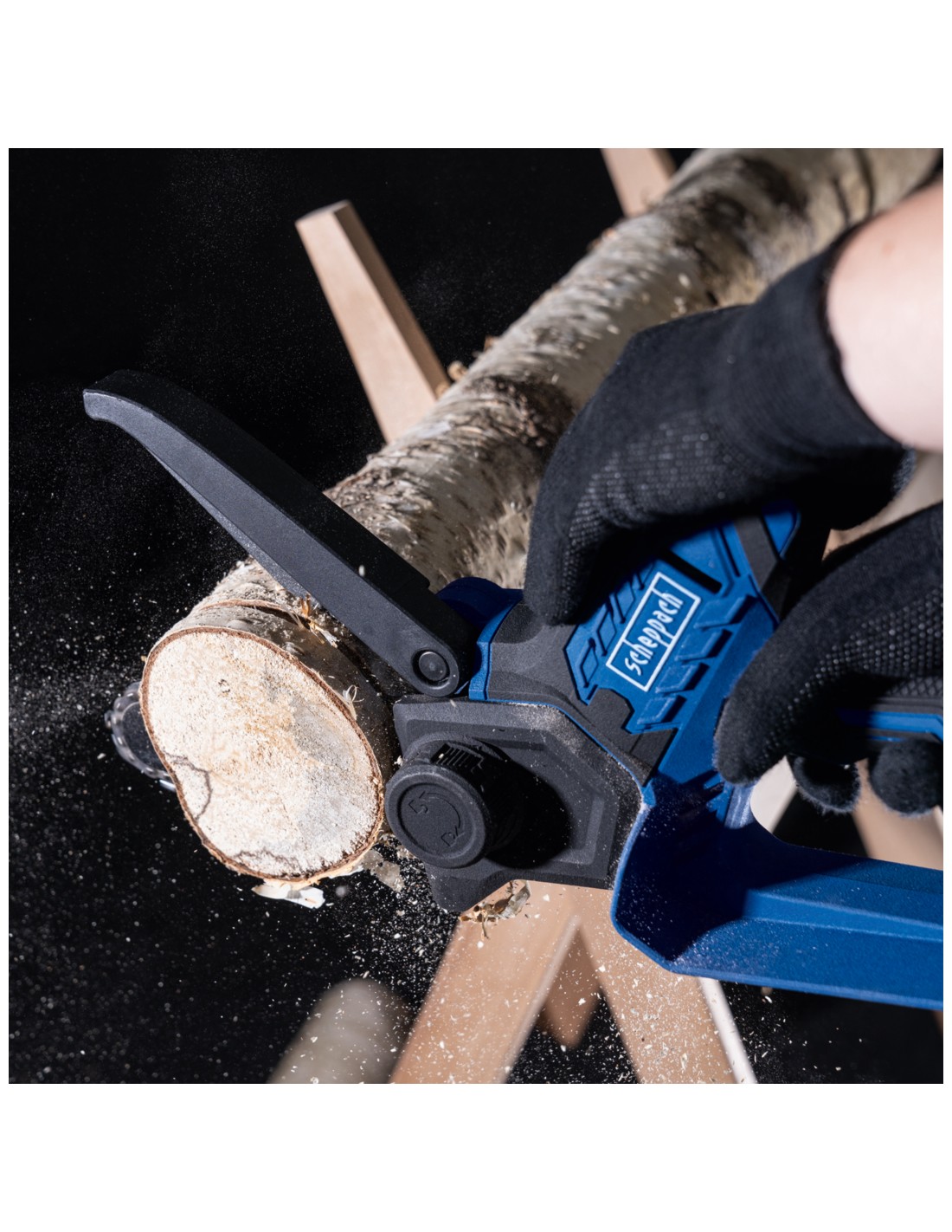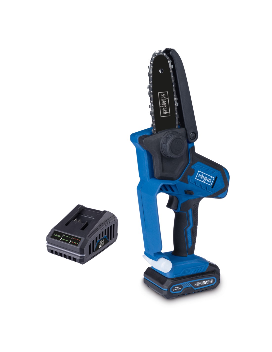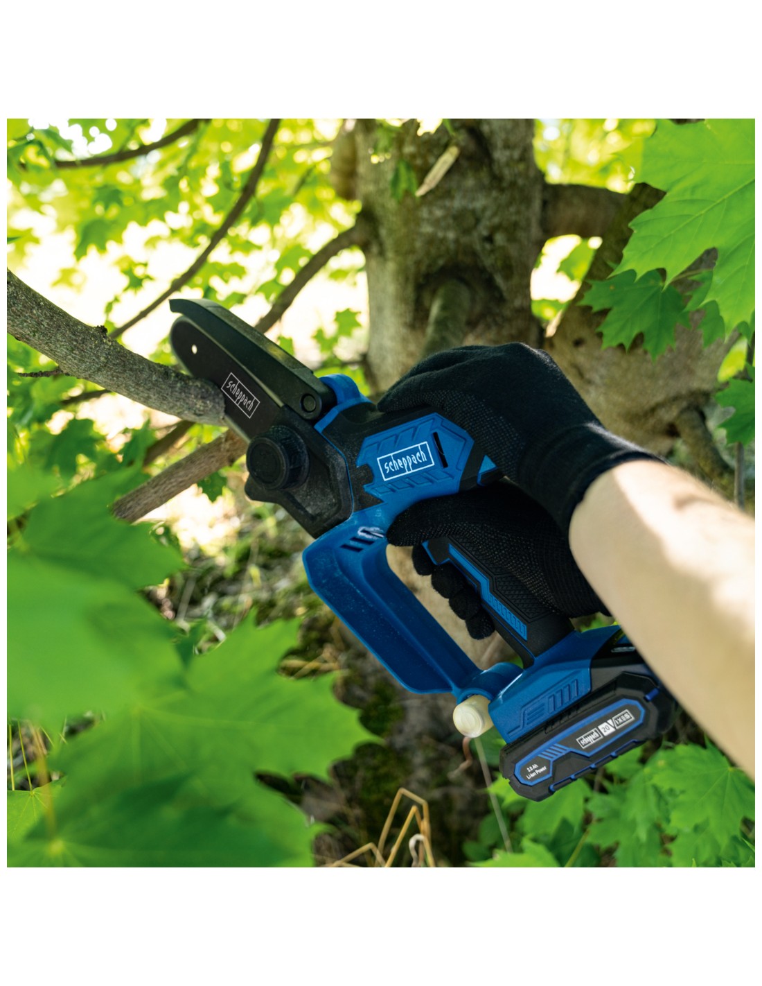 SCIE D'ÉLAGAGE SANS FIL • Scie d'élagage compacte et légère pour la coupe d'arbres et d'arbustes et pour la réduction des déchets verts en petits morceaux • Convient également pour la découpe de planches, de bois carré et rond et pour les projets de bricolage • Travail sans fil avec la série Scheppach IXES 20 V – toutes les batteries et tous les chargeurs appartenant à cette série de systèmes peuvent être combinés avec la scie d'élagage sans fil • Grande lame et chaîne ProCut de 5 pouces • Vitesse de coupe jusqu'à 4,8 m/s pour une progression rapide - Conception compacte permettant de travailler dans les zones difficiles d'accès - Chaîne lisse et à faibles vibrations - Profondeur de coupe maximale de 127 mm - Poignée Softgrip avec interrupteur de sécurité - Protège-main et carter de chaîne pour une manipulation sûre de l'appareil - Réglage de la tension de la chaîne - Rangement pratique de la bouteille d'huile sur l'appareil