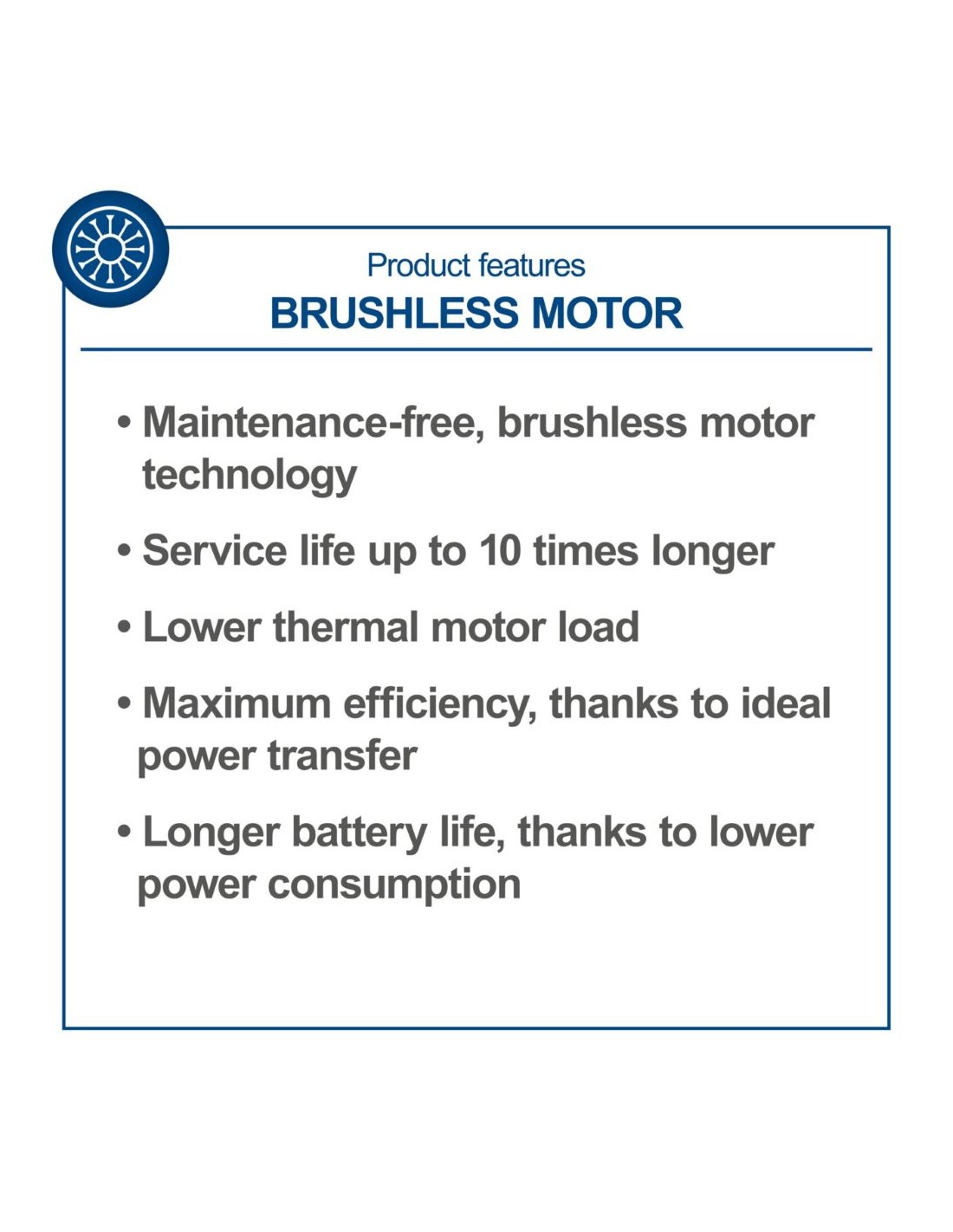 - Moteur Brushless : Plus d’autonomie et durée de vie prolongée, sans entretien.