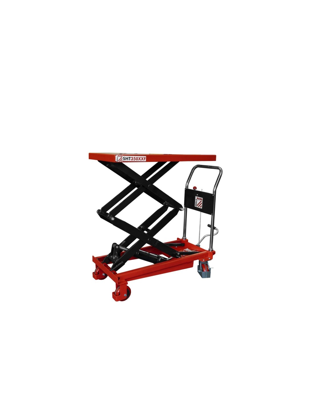 Plate-forme mobile robuste et facile à utiliser, équipée de roues de grand diamètre, d'un guidon repliable et d'une pompe hydraulique.