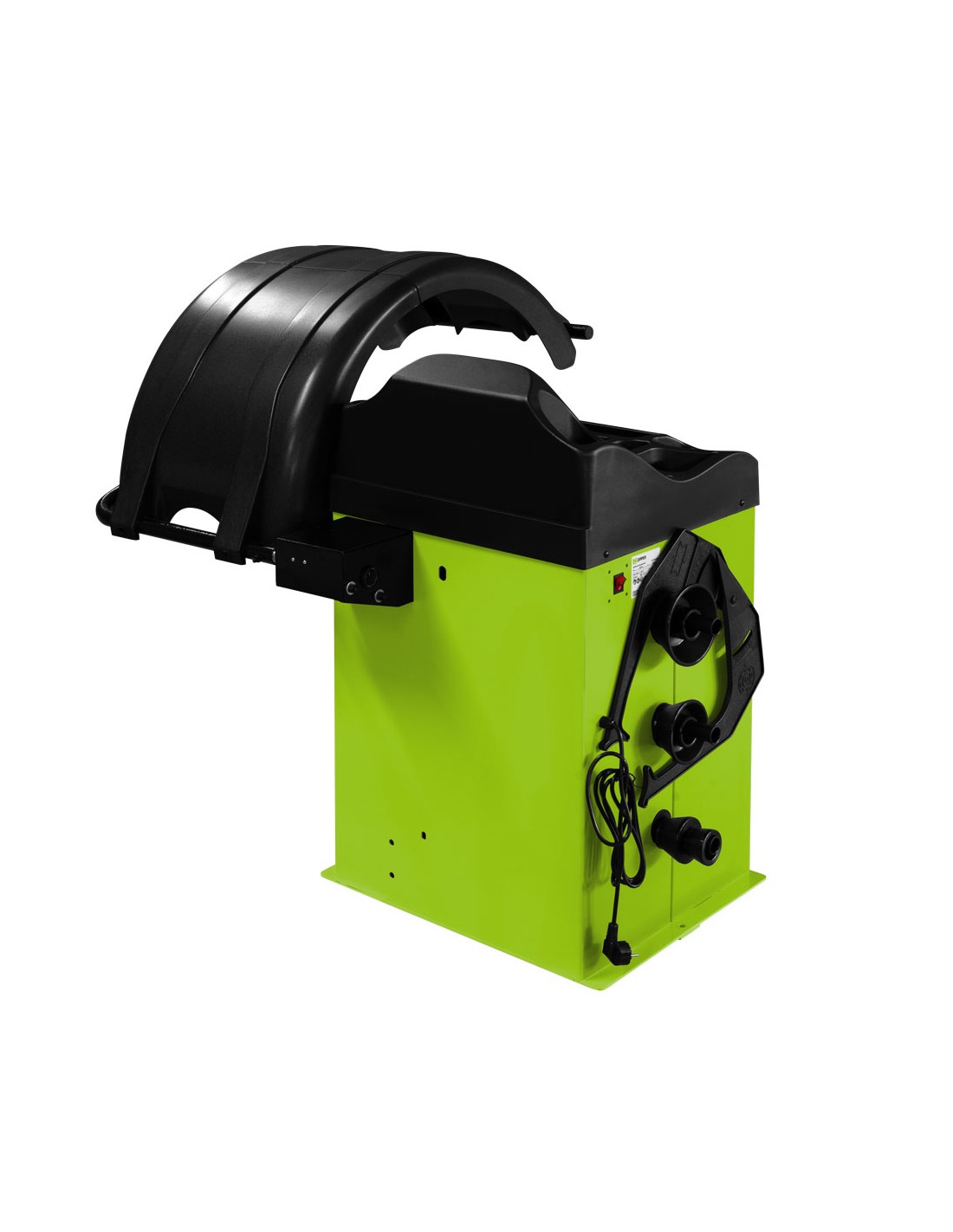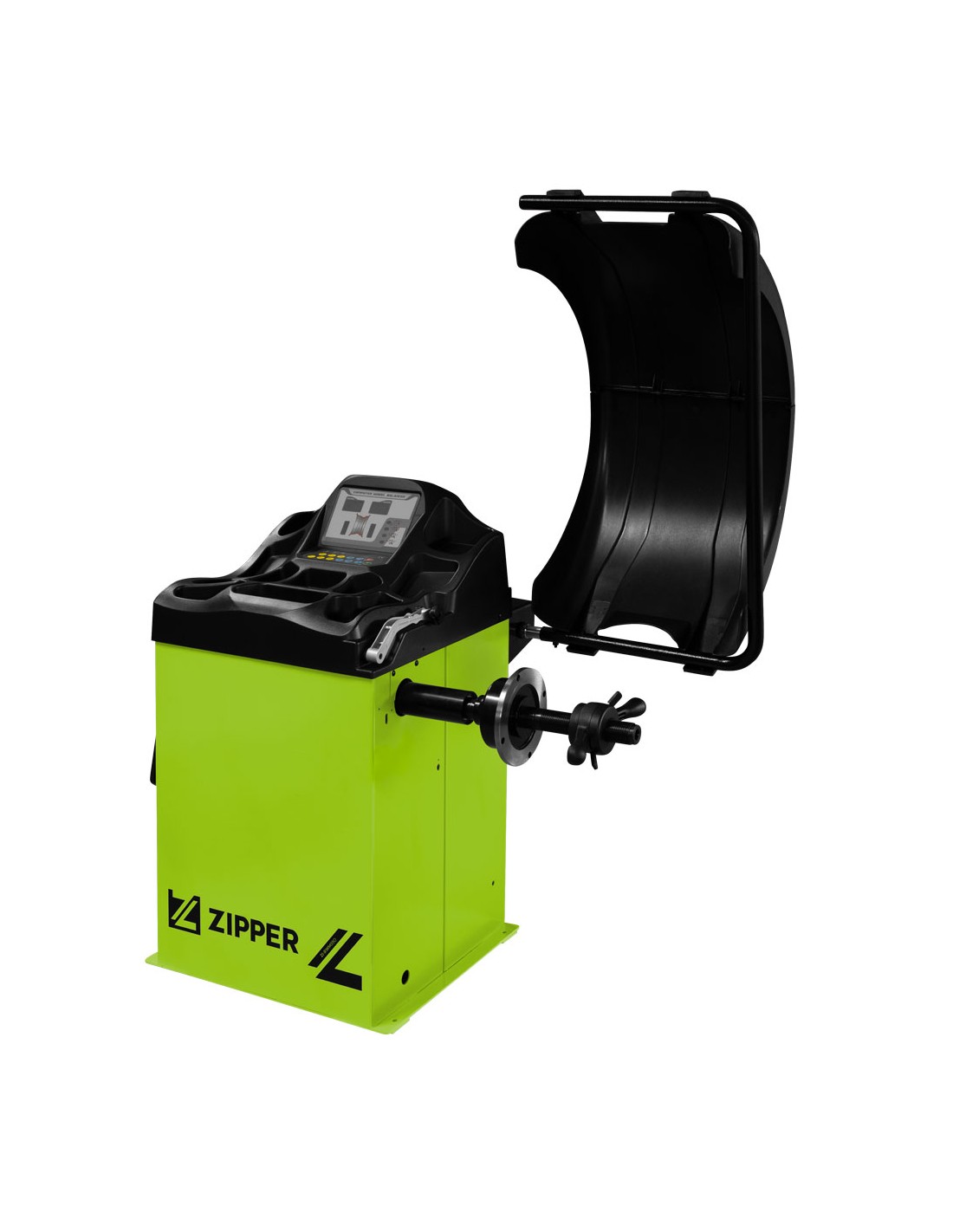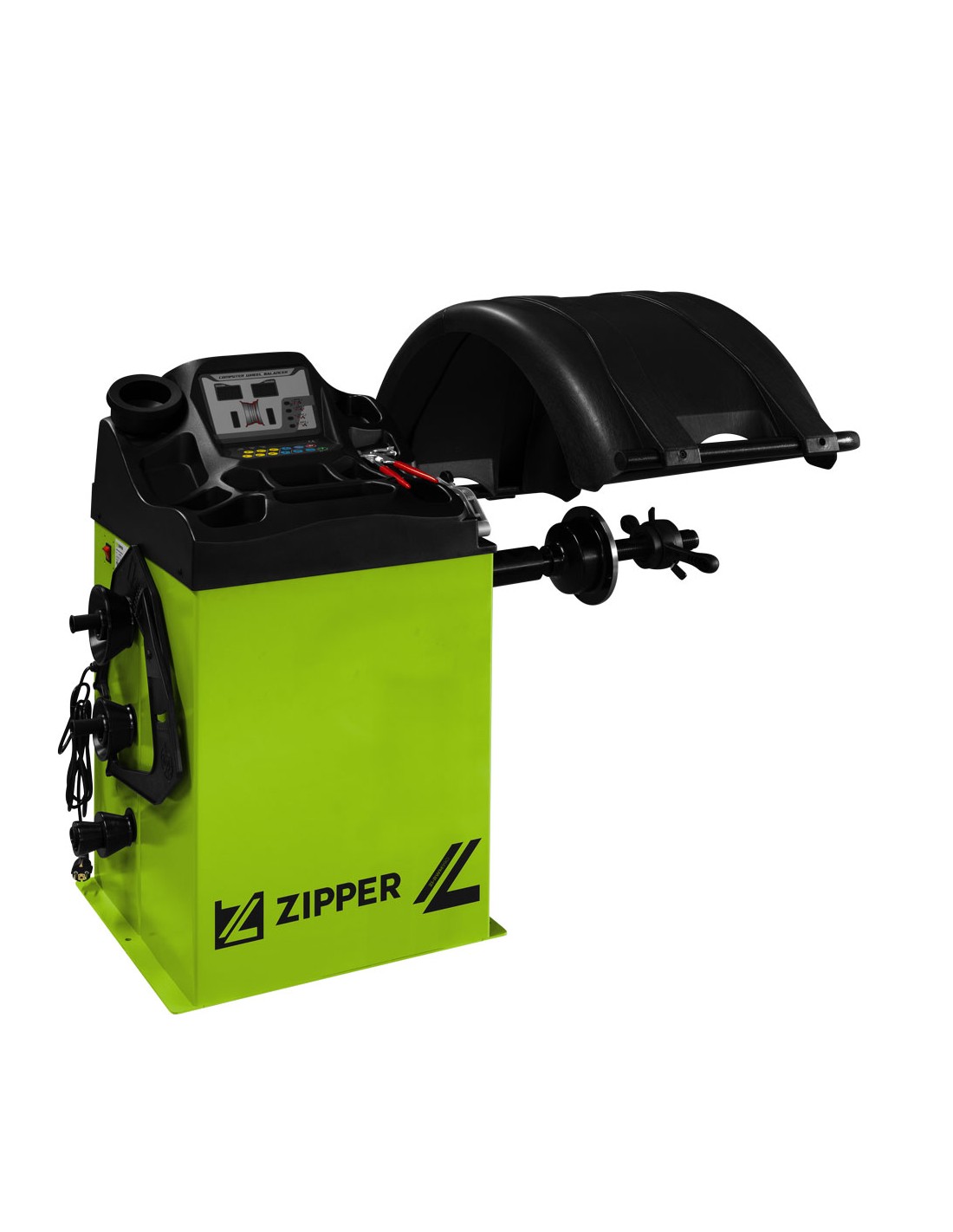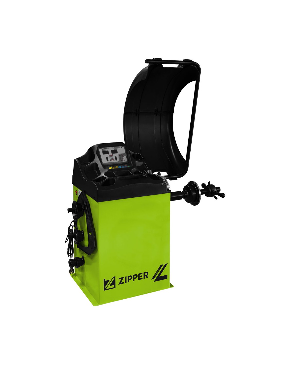 Équilibreuse de pneus ZIPPER ZI-RWM99O avec housse de protection, panneau de commande intuitif et options de rangement pratiques pour les poids/cônes d'équilibrage.