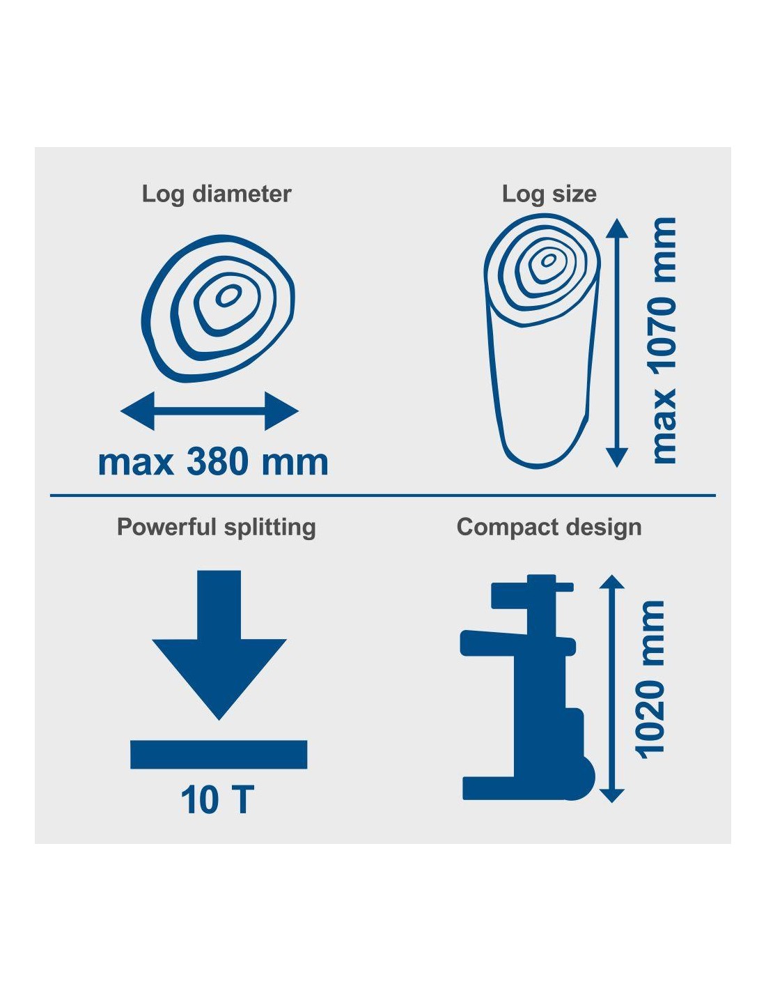 D'une capacité de 10 tonnes, le couteau diviseur du Scheppach Compact 10t fend des matériaux d'une longueur allant jusqu'à 1070 mm et d'un diamètre maximum de 380 mm.