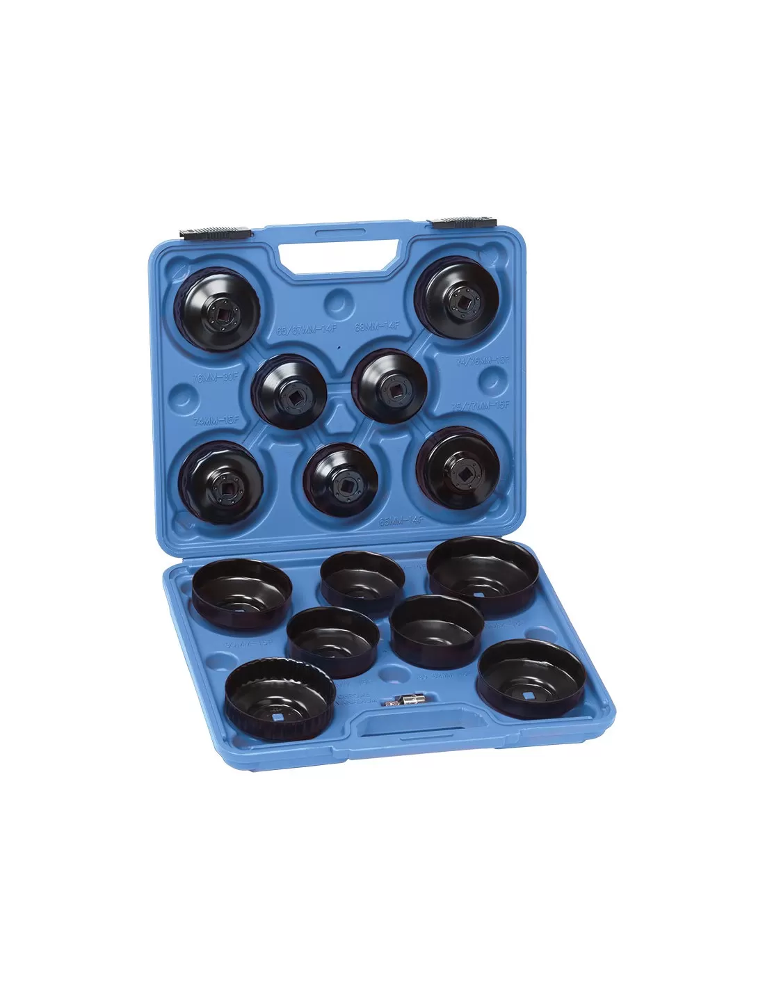 Utile pour le démontage des filtres à huile de nombreux véhicules. Un adaptateur avec entraînements 3/8" mâle et 1/2" femelle est inclus dans le kit.