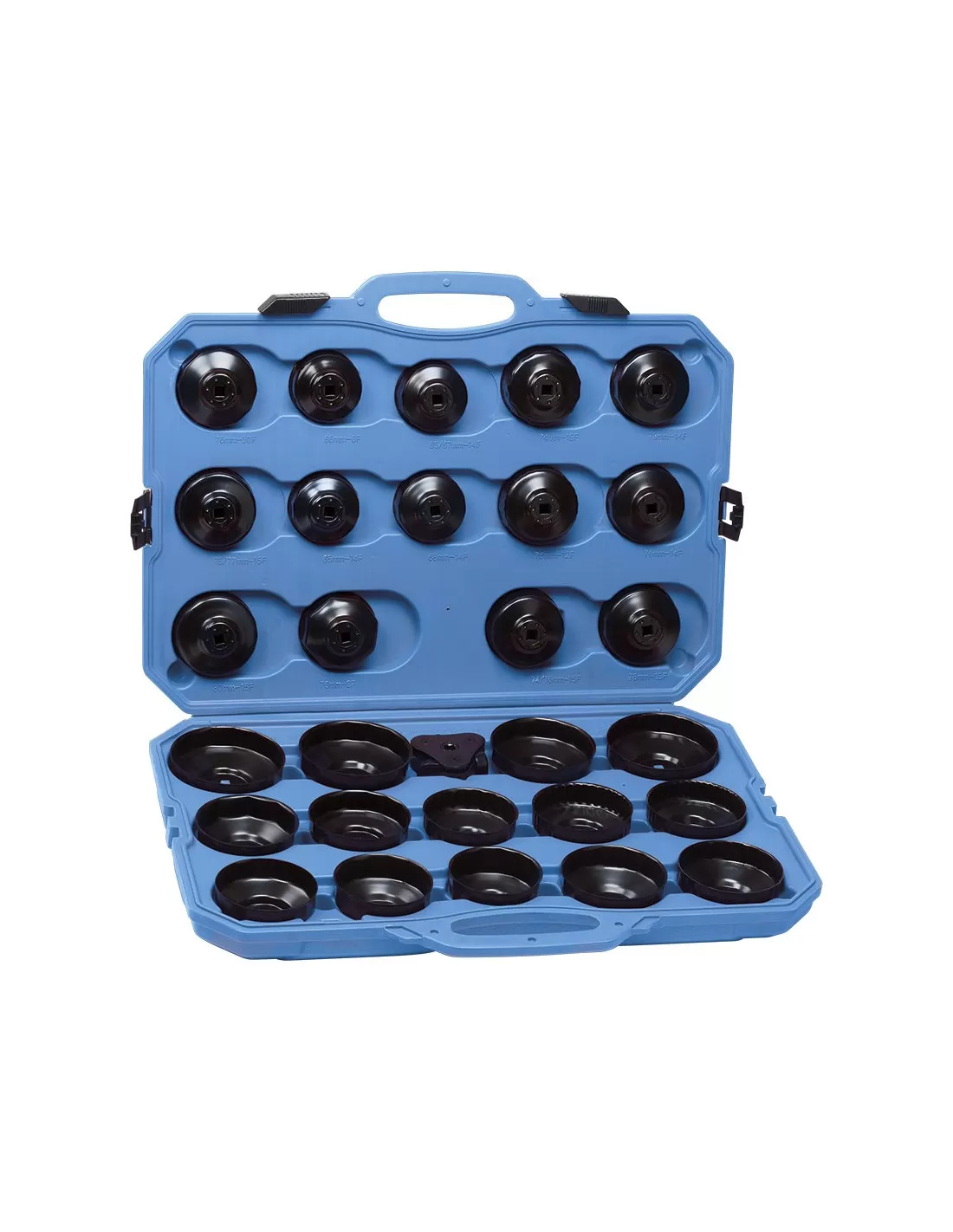 Utile pour le démontage des filtres à huile de nombreux véhicules. Un adaptateur avec entraînements mâles 3/8" et femelles 1/2" et une clé à 3 mâchoires sont inclus dans le kit.