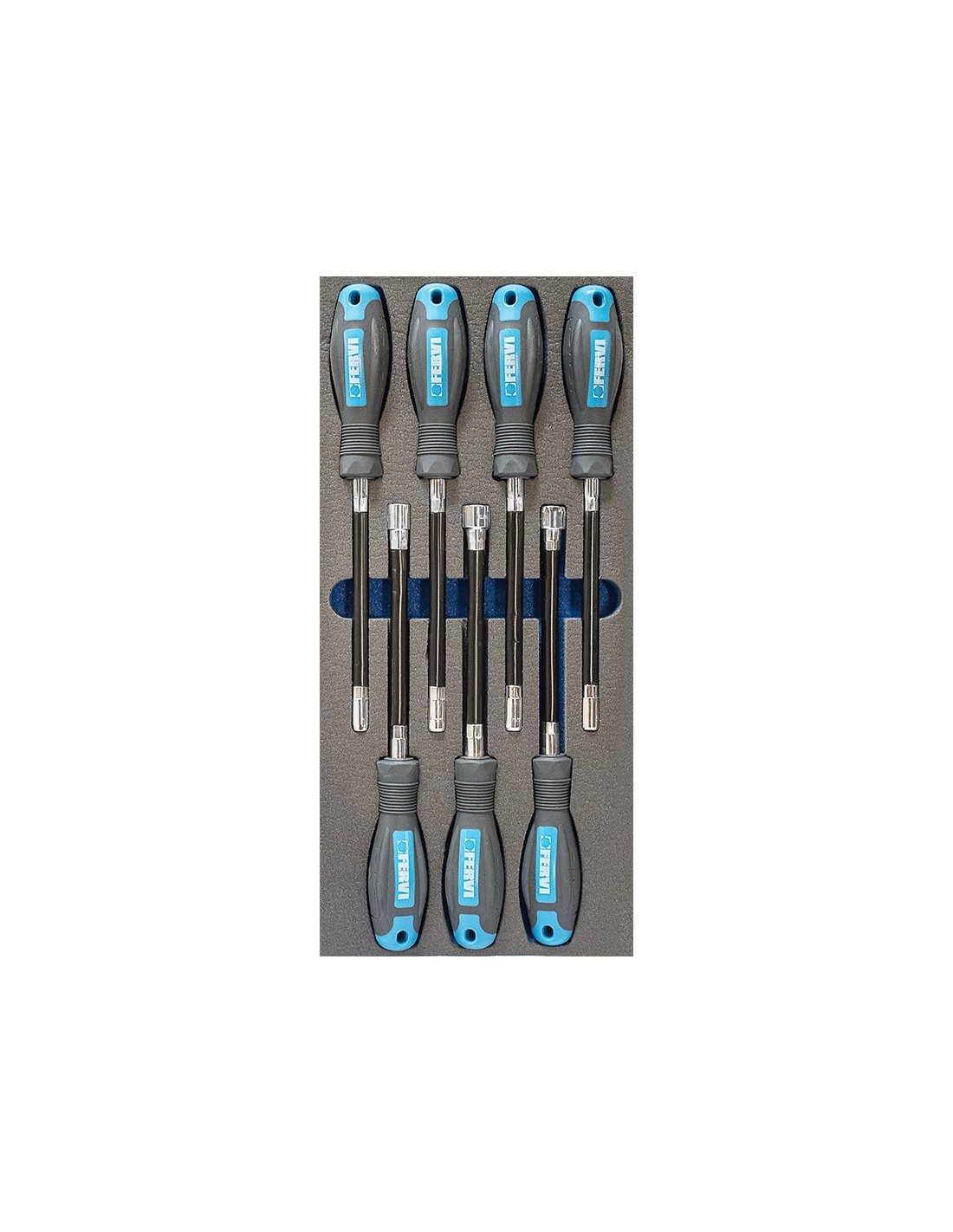 Plateau en mousse de polyéthylène à 4 couches en 2 couleurs : gris-bleu fraisé avec une machine à commande numérique avec un jeu d'outils.