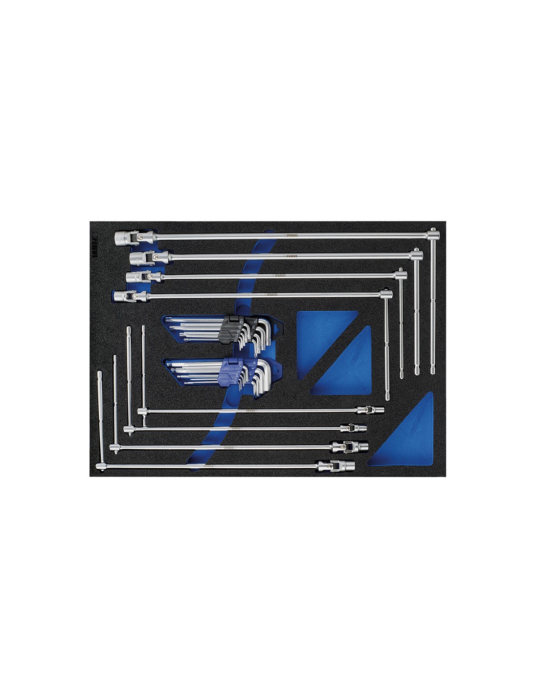 Plateau en mousse de polyéthylène à 4 couches en 2 couleurs : gris-bleu fraisé avec une machine à commande numérique avec un jeu d'outils.