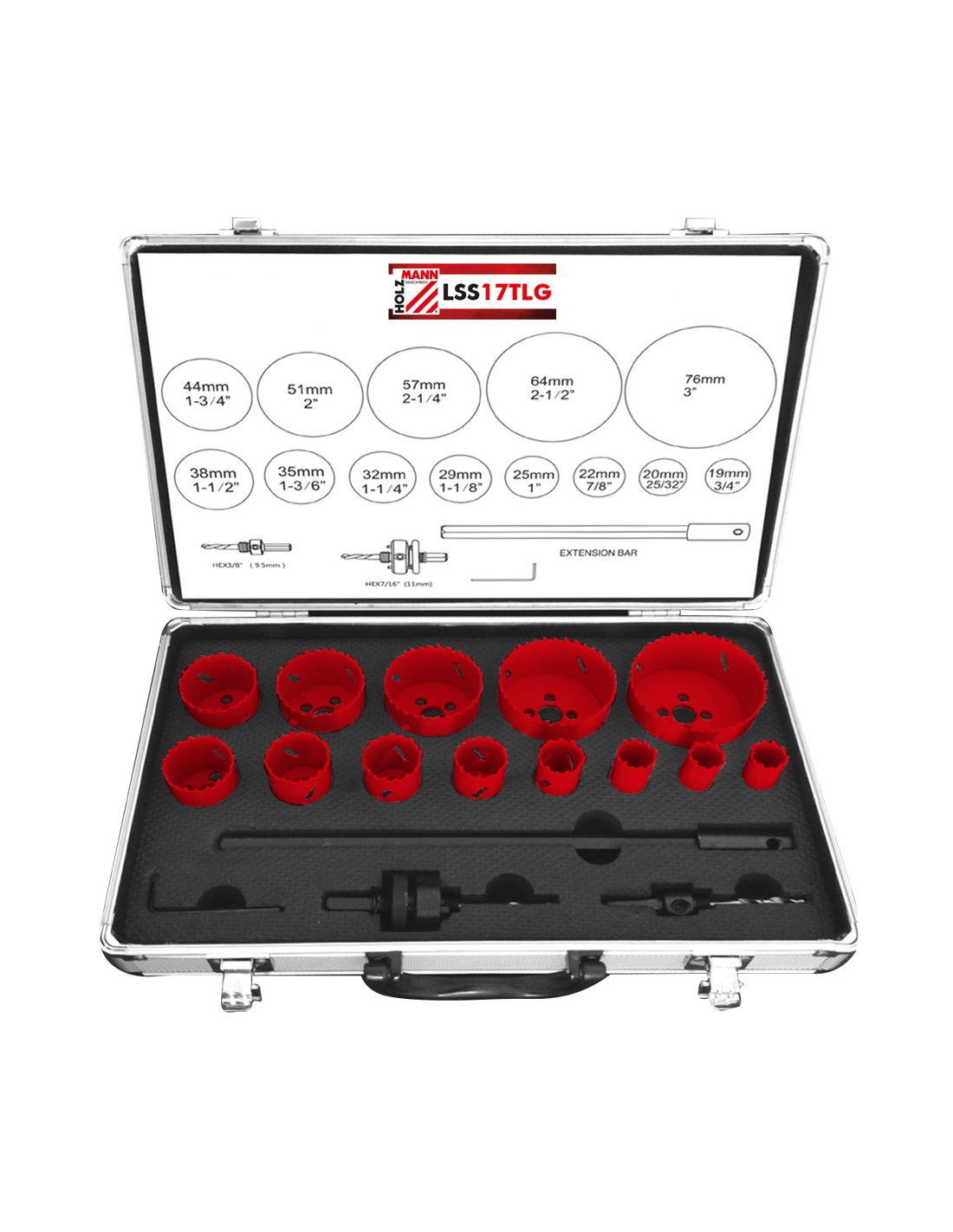 Jeu de scies cloches à bois HSS 19 mm, 20 mm, 22 mm, 25 mm, 29 mm, 32 mm, 35 mm, 38 mm, 44 mm, 51 mm, 57 mm, 64 mm, 76 mm