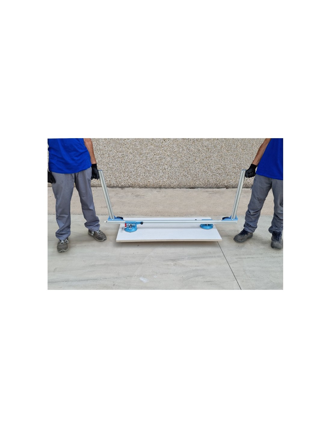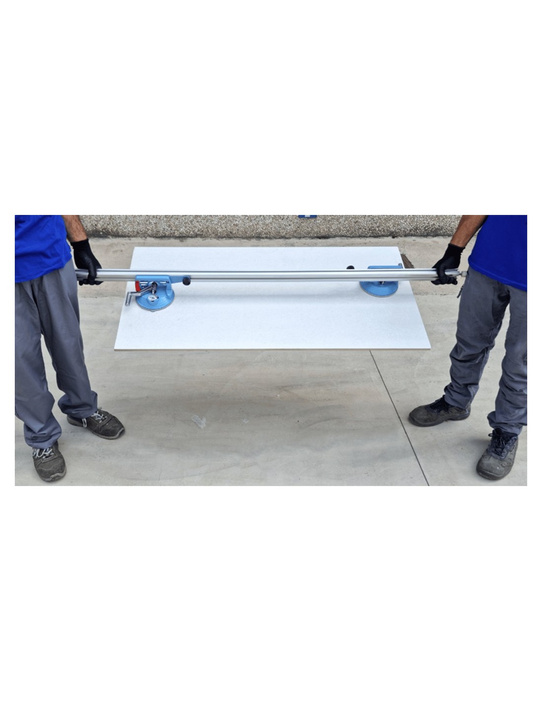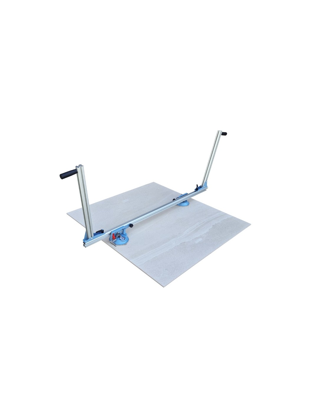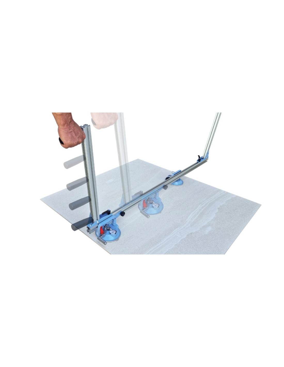 SIGMA Art.1E “Ergo-Lift”: équipement pour la manutention et la pose de carreaux lourds de dimensions allant de 60x60cm à 180x80cm. Grâce à sa structure légère mais robuste en aluminium et aux poignées surélevées, elle permet de poser les carreaux au sol en maintenant la posture de l'opérateur droite, particulièrement adaptée à la pose de carreaux épais (2 cm). En retirant les poignées surélevées, il peut être utilisé facilement pour la pose de carreaux avec un faible poids lors du collage. Equipé de deux ventouses Pro-Grip pour une adhérence maximale même sur les carreaux texturés. Une paire d'Ergo-Lifts peut être utilisée pour déplacer des carreaux particulièrement lourds.